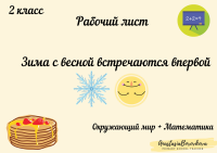 Рабочий лист к УМК "Перспектива", 2 класс, включает в себя задания по окружающему миру по теме "Зима с весной встречается впервой" и математике по теме "Сложение и вычитание без перехода через десяток". Для составления рабочего листа использовалась тетрадь по математике 2 класса Дорофеев Г.В. , Миракова Т.Н., учебник по окружающему миру 2 класс Плешаков А.А., Новицкая М.Ю., а также собственные разработки по теме "Масленица".