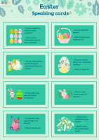 Easter speaking cards для А2 — В2 Вопросы для обсуждения одного из самых любимых детских праздников, которые можно использовать как для разговорной практики на занятии, так и для подготовки сочинений, проектов в домашнем задании. В набор входят 8 тематических карточек, включающих в себя 13 вопросов на тему праздника Пасхи.Карточки представлены в двух размерах (8 штук на листе А4, по 3 карточки на листе А4).