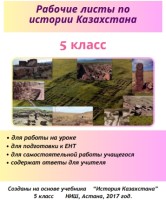 "Рабочие листы по истории Казахстана" для учащихся 5 класса представляют собой учебное пособие, разработанное для систематизации знаний об историческом прошлом родной страны. Каждый рабочий лист содержит интерактивные задания, которые способствуют углубленному пониманию материала, развитию навыков исторического анализа и критического мышления. Целью пособия является не только формирование базовых знаний о прошлом страны, но и развитие интереса к изучению истории Казахстана, его культурного наследия и вклада в мировую историю. Рабочие листы разработаны к учебнику "История Казахстана" НИШ, Астана, 2017 год. Применение рабочих листов на уроке может быть различным. Например, учитель может использовать их для проверки знании учеников или для организации групповои работы. Также рабочие листы могут быть использованы для подготовки к экзаменам или тестам. Представлен один рабочий лист.