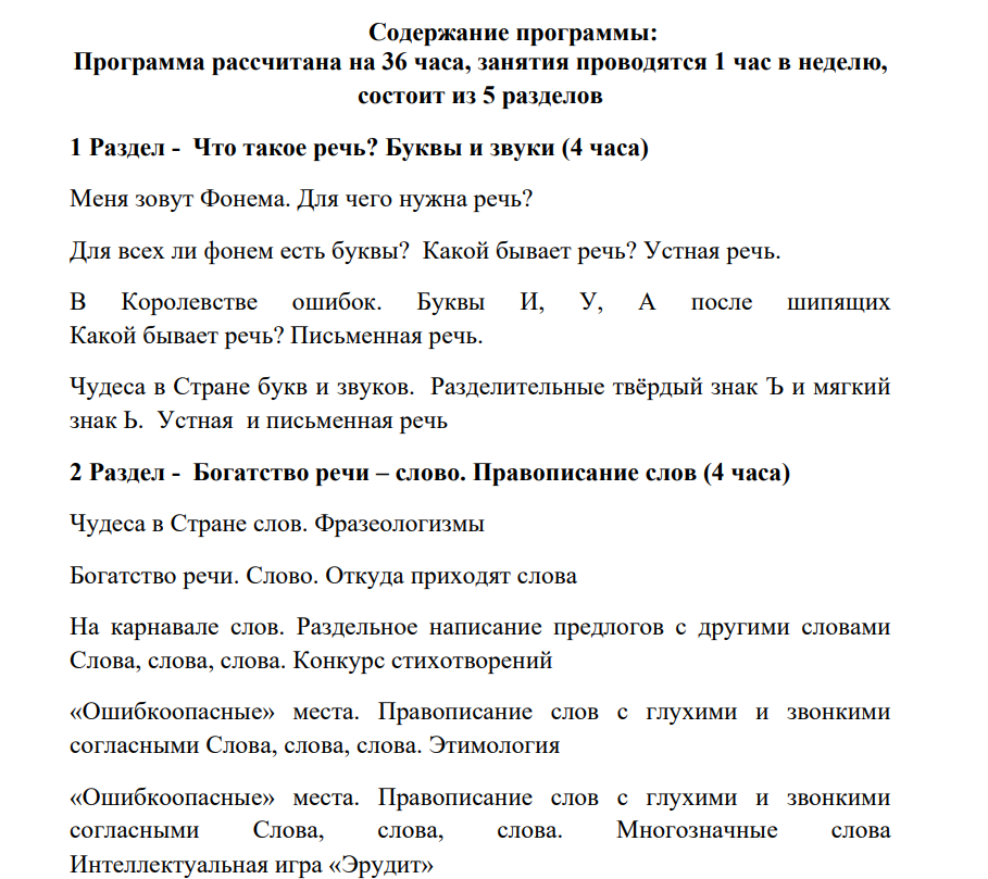 Программа рассчитана на 36 часов, занятия проводятся 1 час в неделю, состоит из 5 разделов