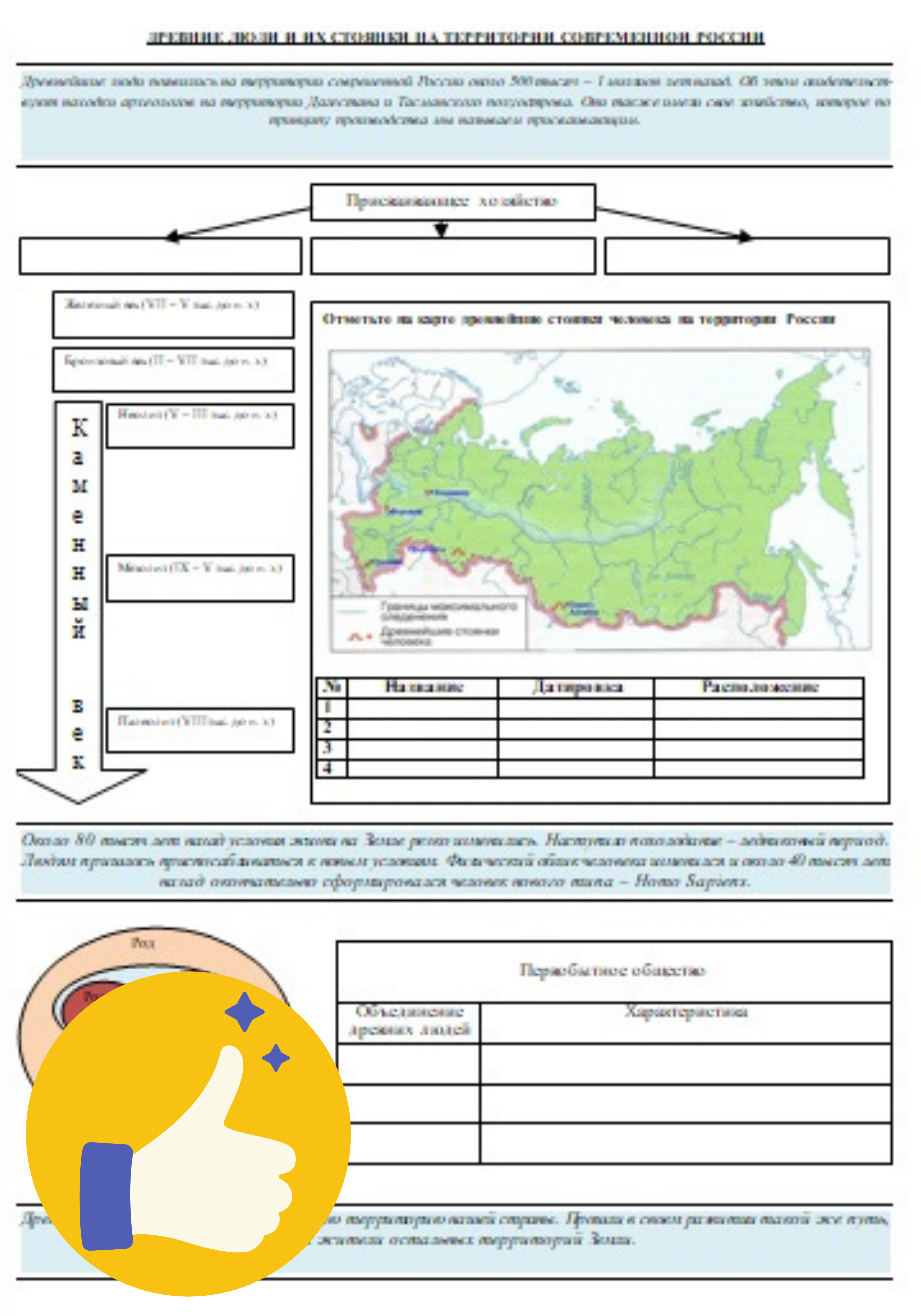 Рабочий лист предназначен для учащихся 6 класса, начинающих знакомство с историей России. Материал включает в себя информационные вставки, наглядную периодизацию, карту "Первые стоянки человека" и др..