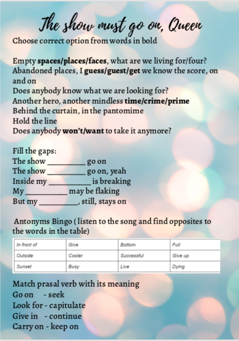 Задания по 6 песням позволяют расширить словарный запас и улучшить навыки аудирования, а также разнообразить задания для студентов. Задания можно использовать в онлайн режиме через Google Classroom, а также провести небольшой марафон.