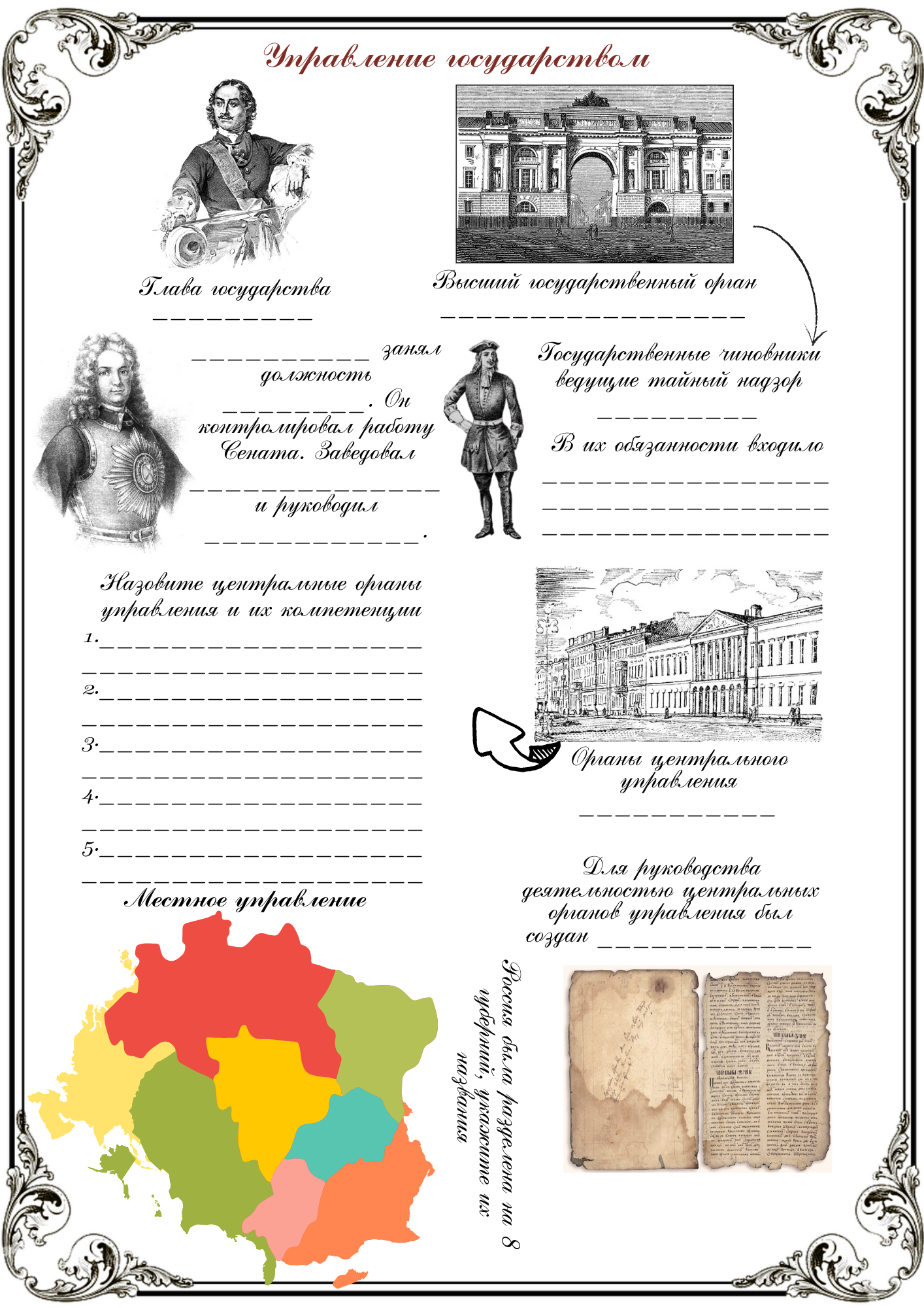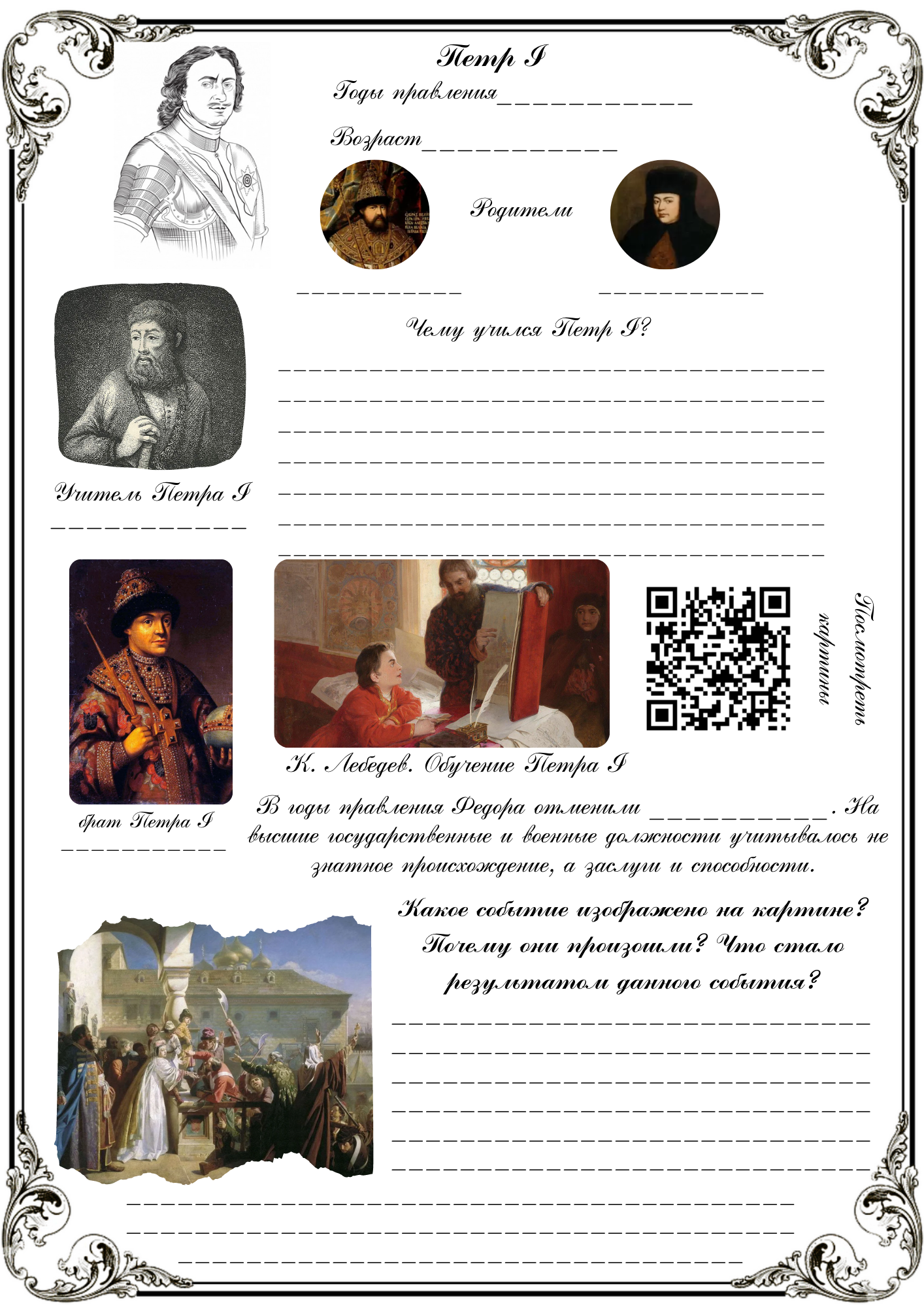 Тетрадь представляет собой комплекс тематических заданий по эпохе Петра I. Отражены внешняя и внутренняя политика, иллюстрации, QR-коды, задания к контурным картам, блок культуры. Тетрадь отлично подходит, как в качестве доп. материала к уроку, так и для повторения материала.