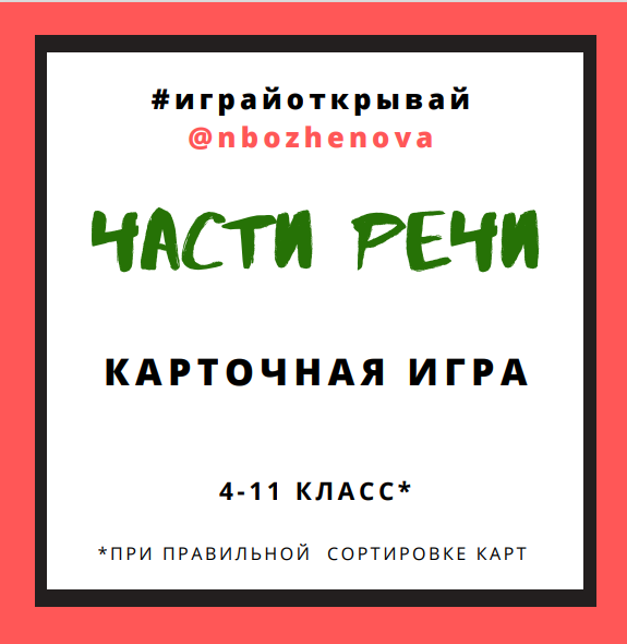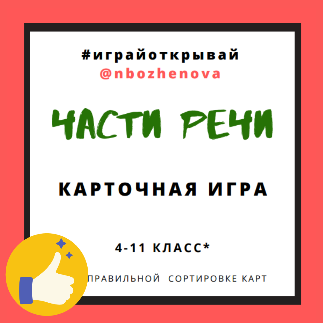 Карточная игра на закрепление темы "Части речи" для 4-11 класса. В документе инструкция и набор карточек для печати. Игра ориентирована на группу учащихся до 10 человек, но можно играть в командах. Простая и динамичная игра прокачает внимание и навыки ориентирования в разных частях речи.