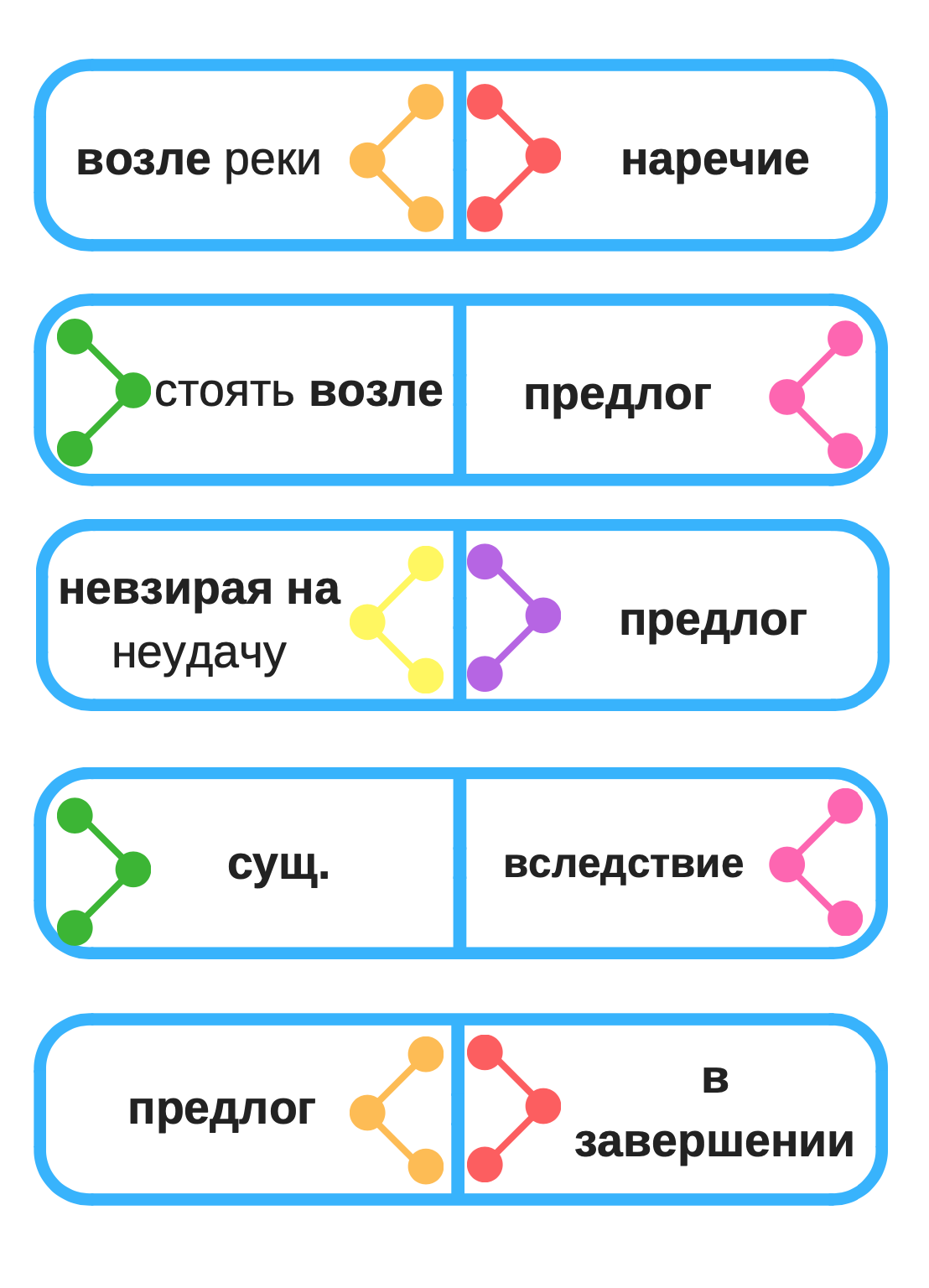 Игра по принципу домино поможет научиться отличать производные предлоги от других частей речи.