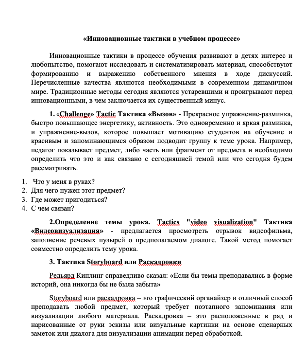 Инновационные тактики в процессе обучения развивают в детях интерес и любопытство, помогают исследовать и систематизировать материал, способствуют формированию и выражению собственного мнения в ходе дискуссий. Перечисленные качества являются необходимыми в современном динамичном мире. Традиционные методы сегодня являются устаревшими и проигрывают перед инновационными, в чем заключается их существенный минус.