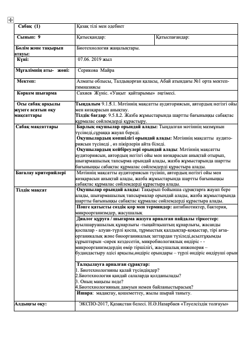 Мәтіннің мақсатты аудиториясын түсініп, автордың негізгі ойы мен көзқарасын анықтай алады, жазба жұмыстарында шартты бағыныңқы сабақтас құрмалас сөйлемдерді құрастыра алады.