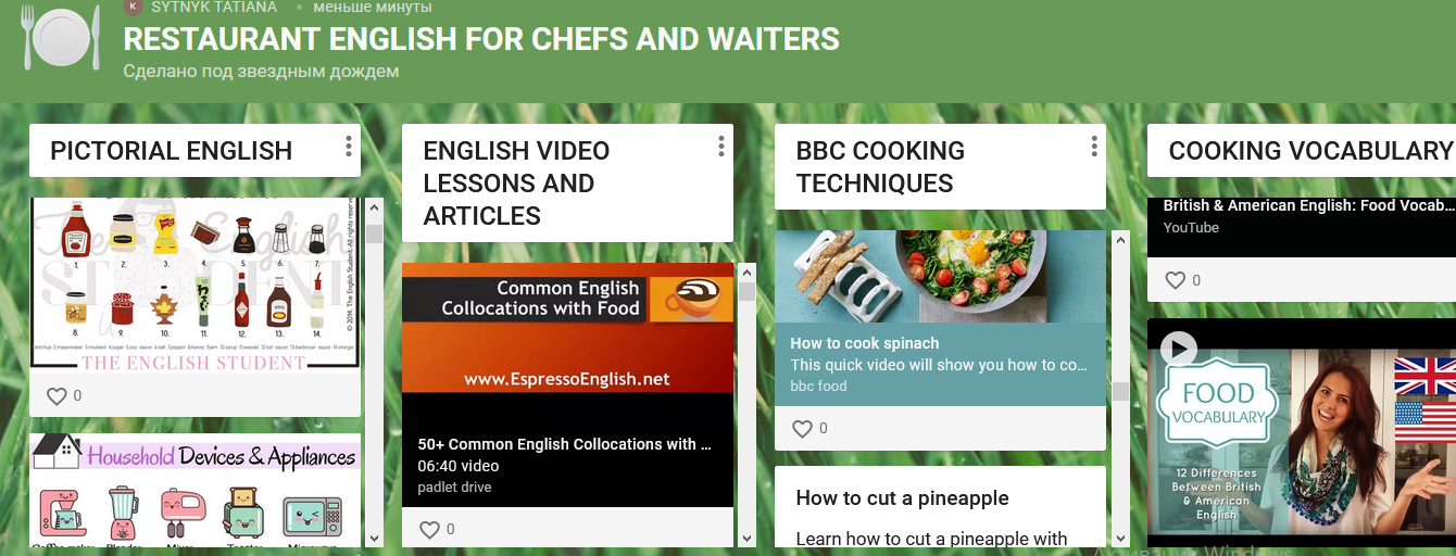Интерактивная доска PADLET (FOOD, BEVERAGES, CONDIMENTS, UTENSILS, COOKING TECHNIQUES)