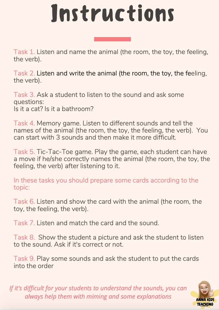 DIFFERENT SOUNDS RELATED TO THE MOST COMMON TOPICS! Task 1. Listen and name the animal (the room, the toy, the feeling, the verb).Task 2. Listen and write the animal (the room, the toy, the feeling, the verb).