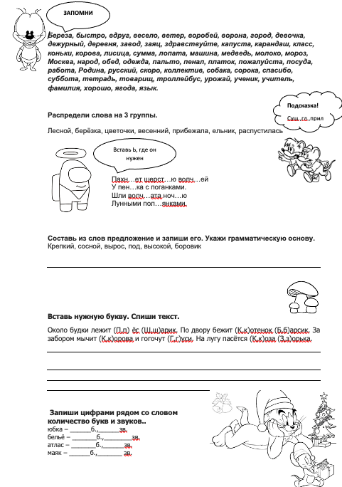 Рабочий лист по русскому языку с заданиями: Распредели слова на 3 группы; Вставь Ь, где он нужен; Составь из слов предложение и запиши его. Укажи грамматическую основу; Вставь нужную букву. Спиши текст; Запиши цифрами рядом со словом количество букв и звуков.