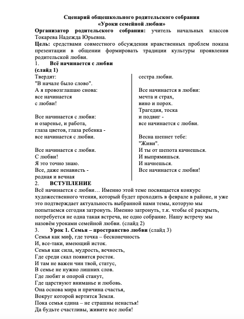 Сценарий общешкольного родительского собрания «Уроки семейной любви»