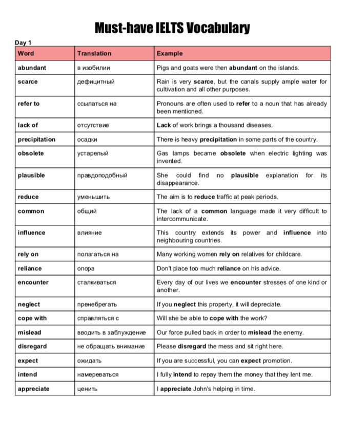 Must-have IELTS Vocabulary: Word - Translation - Example