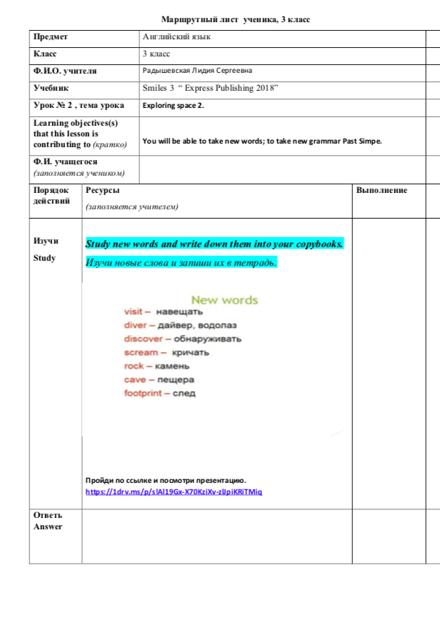 Маршрутный лист ученика, 3 класс, урок на тему: Exploring space 2.