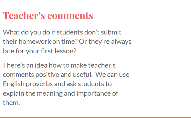 Мне всегда жаль тратить время урока на нравоучения и замечания, поэтому в таких случаях я беру пословицу на английском по теме нарушения и в период warm-up мы разбираем ее значение. Таким образом, воспитательная работа проводится не в ущерб уроку.