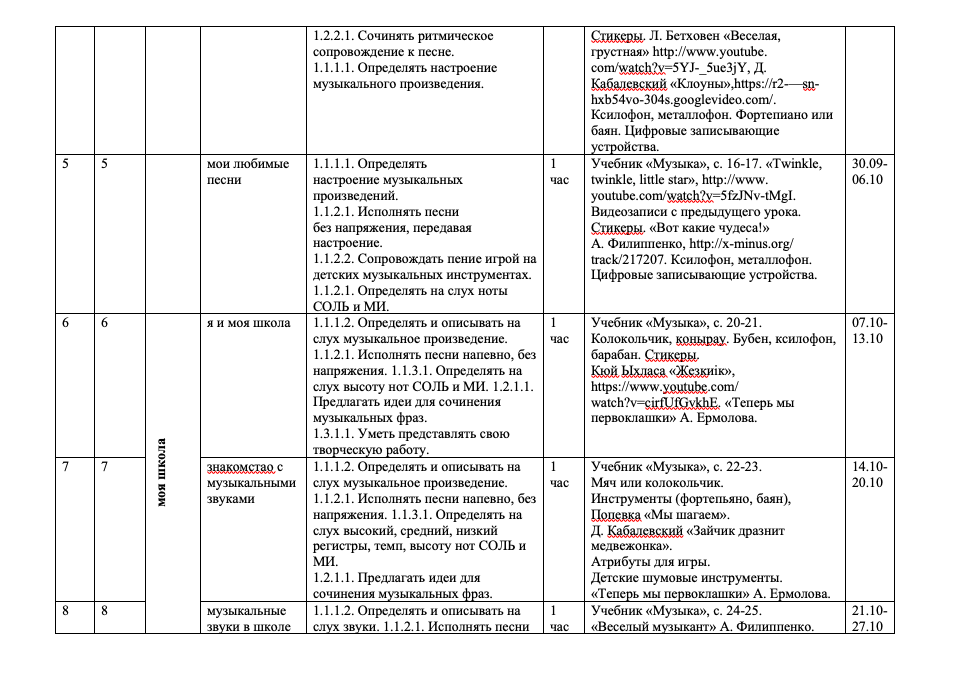 КСП по музыке для 1 класса на 33 урока