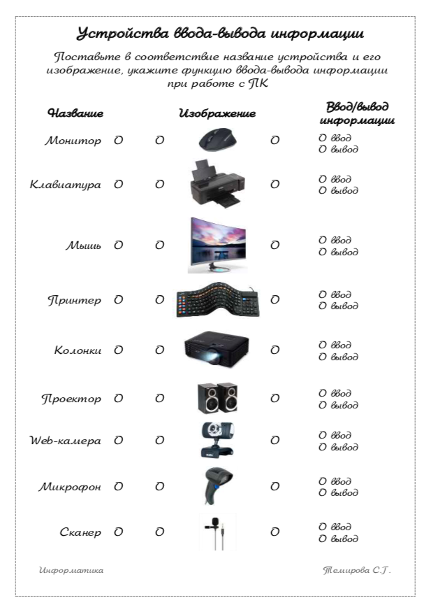 Устройства ввода-вывода информацииИнструкция по заданию: Поставьте в соответствие название устройства и его изображение, укажите функцию ввода-вывода информации при работе с ПК