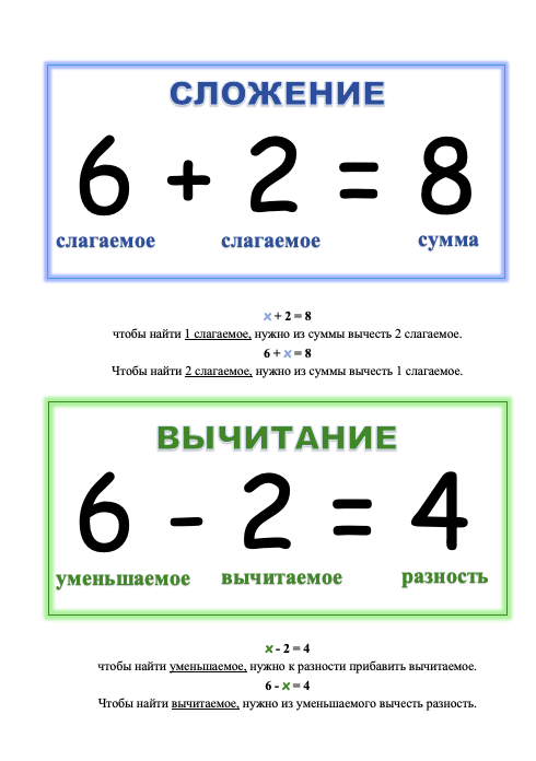 Памятка по математике: сложение, вычитание, умножение, деление в формате word