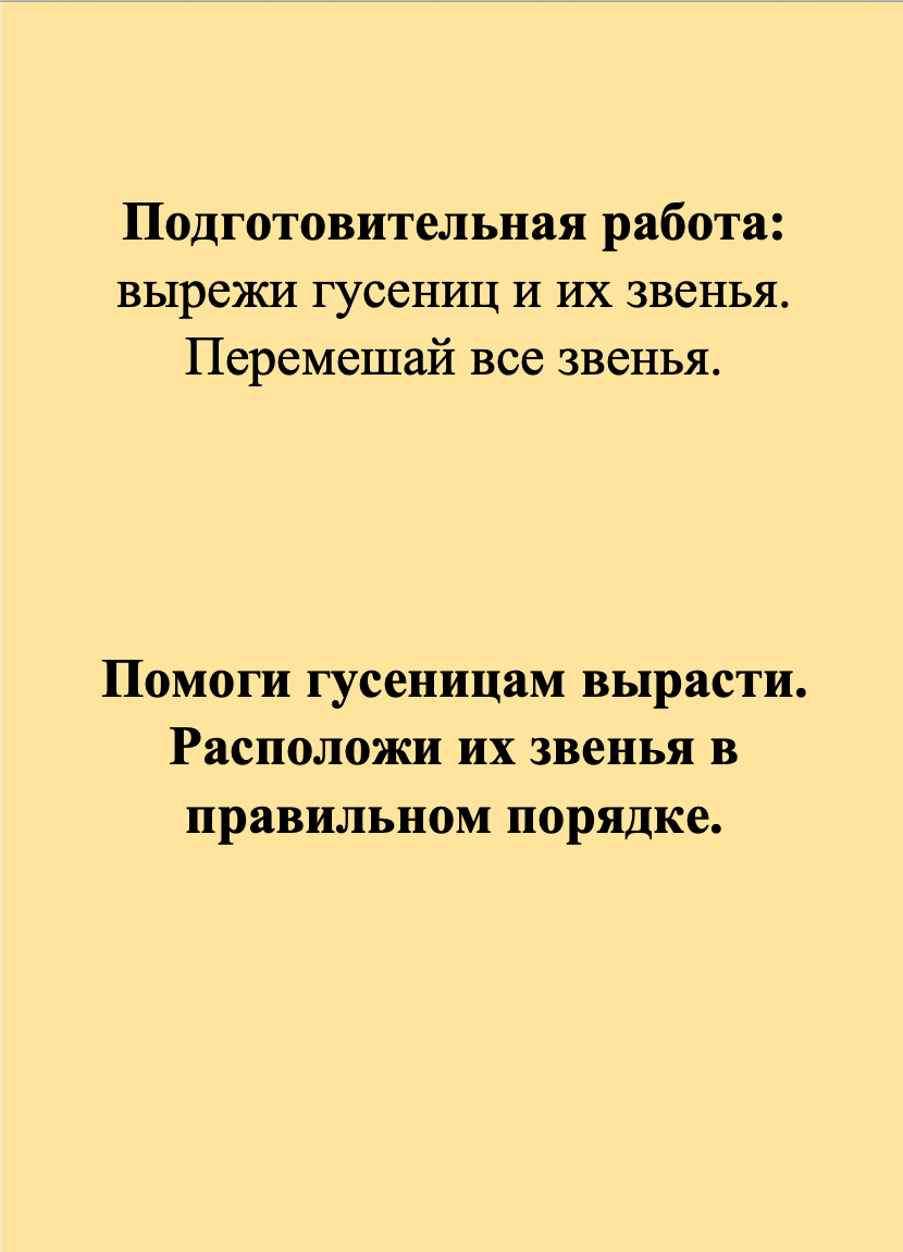 Подготовительная работа:вырежи гусениц и их звенья. Перемешай все звенья.Помоги гусеницам вырасти. Расположи их звенья в правильном порядке.