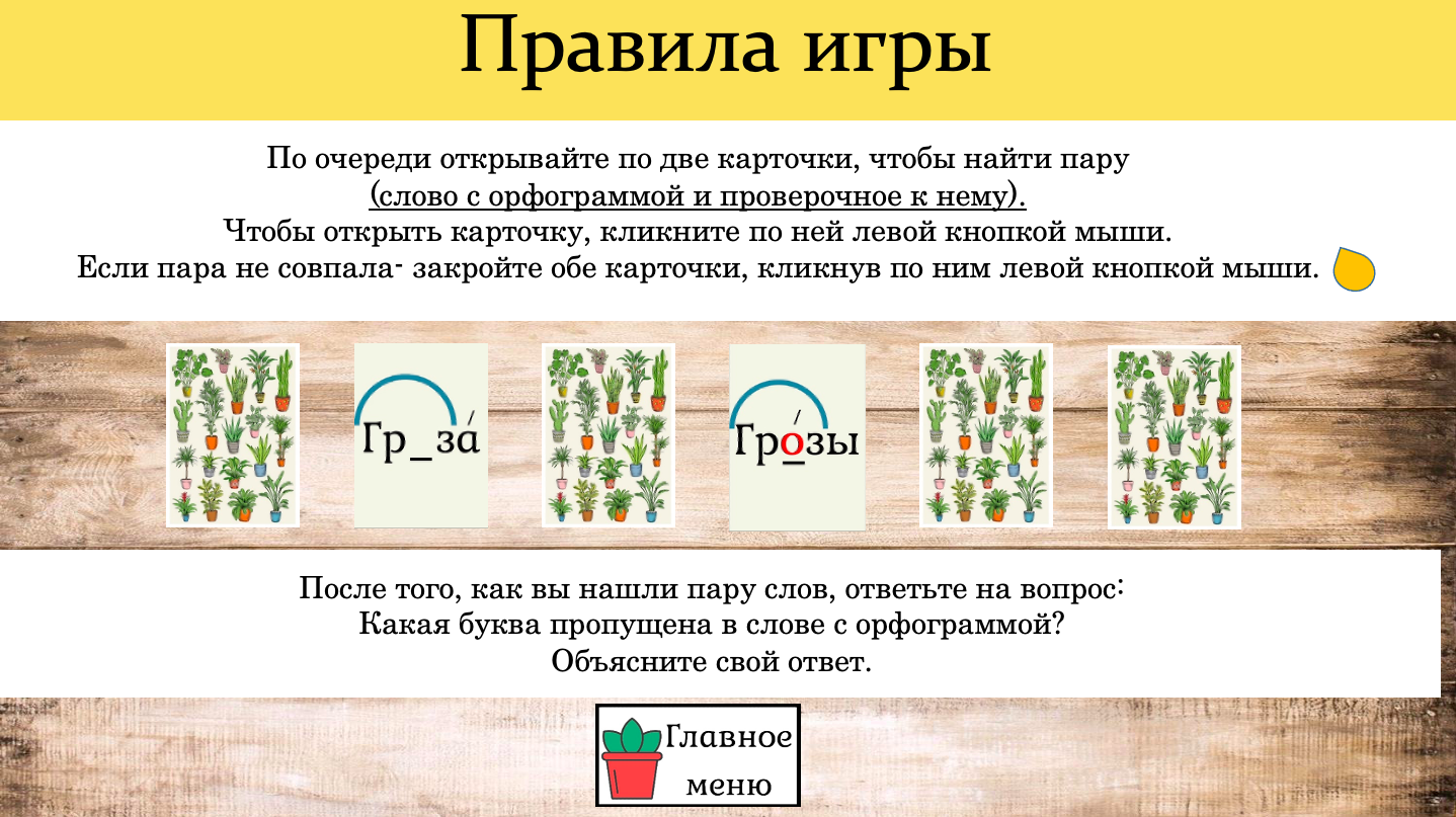 Интерактивная презентация-игра "Безударные гласные в корне слова". По очереди открывайте по две карточки, чтобы найти пару (слово с орфограммой и проверочное к нему). Чтобы открыть карточку, кликните по ней левой кнопкой мыши.