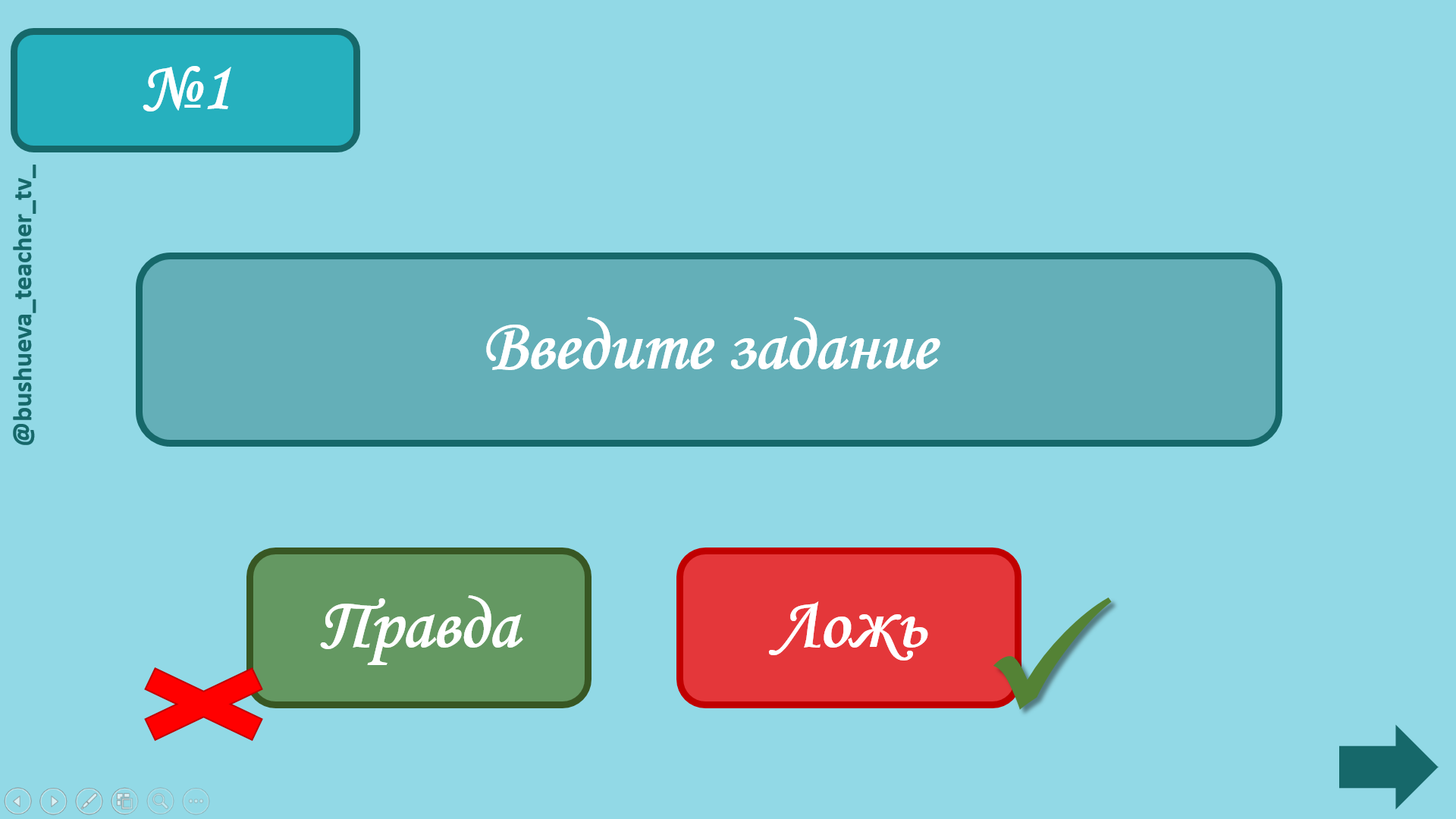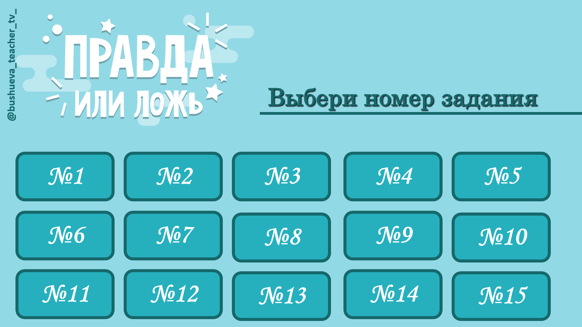 Викторина, где нужно угадать, ложное или правдивое утверждение перед вами находится. В шаблон игры возможно ввести 15 утверждений, лишние ячейки можно удалить. При нажатии на кнопку "ложь" высветится крестик, при нажатии на кнопку "истина" высветится галочка. Вам нужно лишь ввести свои утверждения и игра готова!