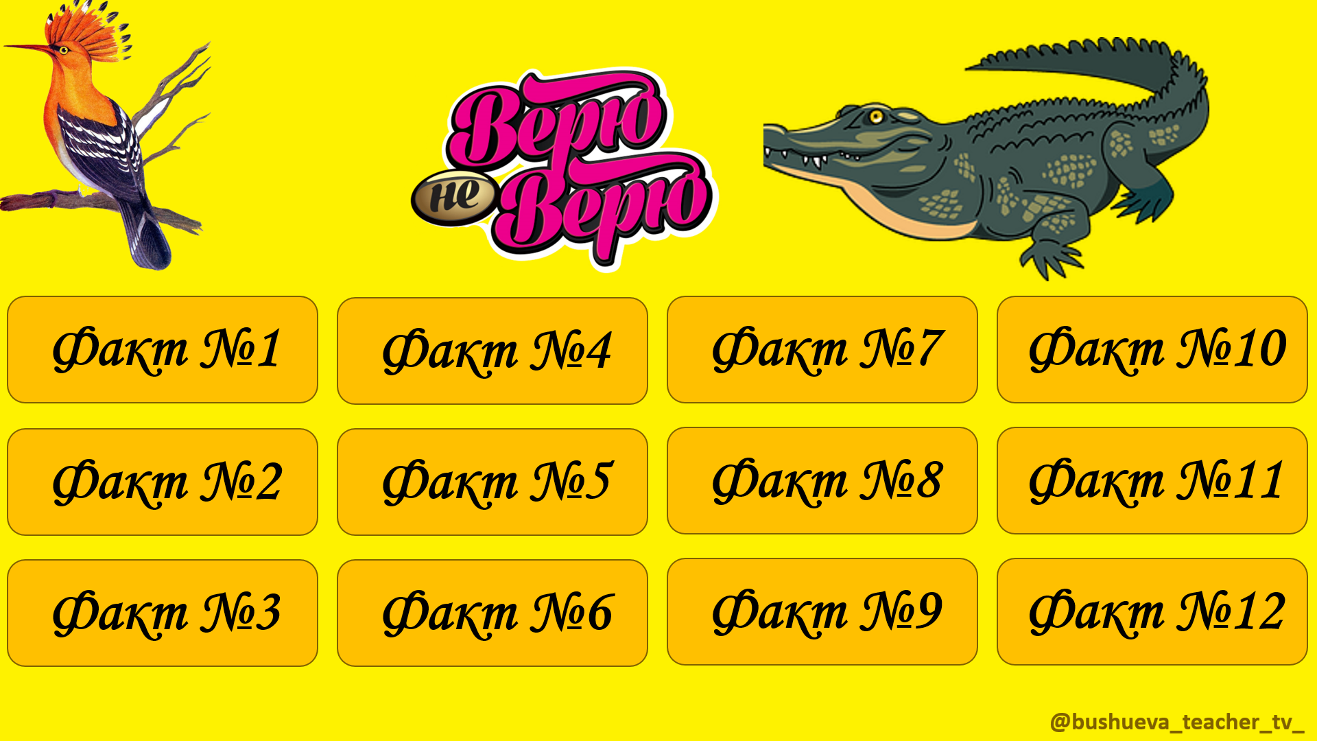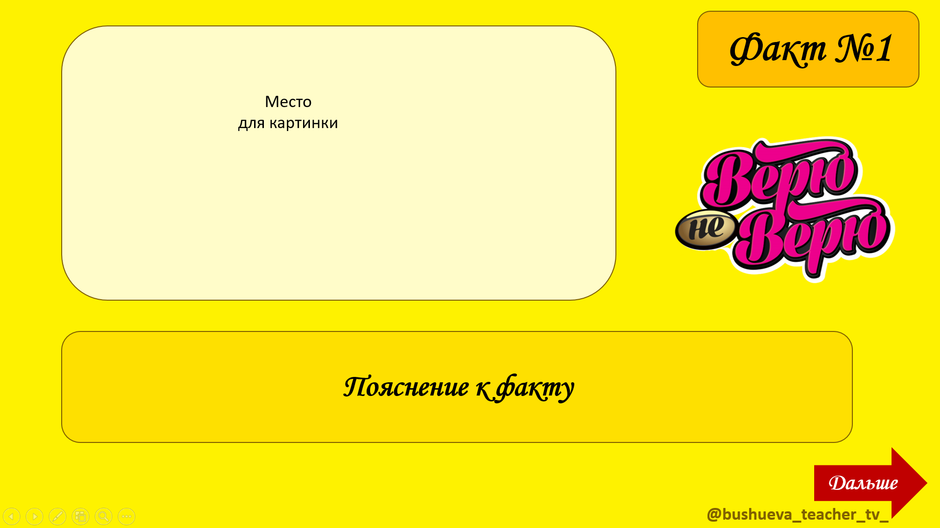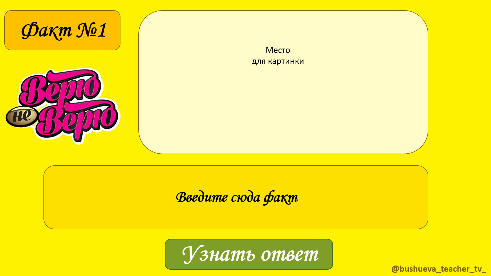 Замотивируйте детей на открытие новых знаний с помощью шаблона игры "Верю- Не верю"! Найдите интересные факты из любой сферы, занесите их в готовые поля внутри презентации, добавьте пояснение к факту и всё! Игра готова!