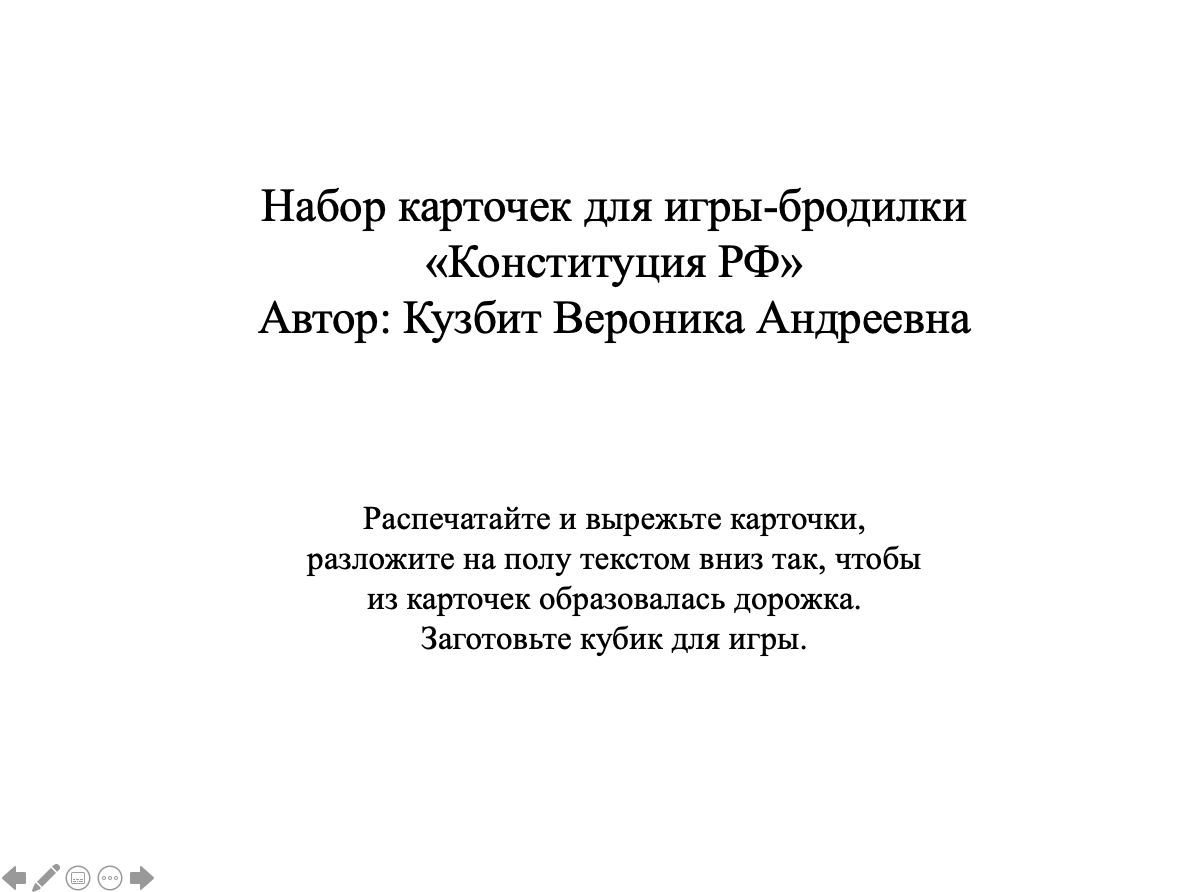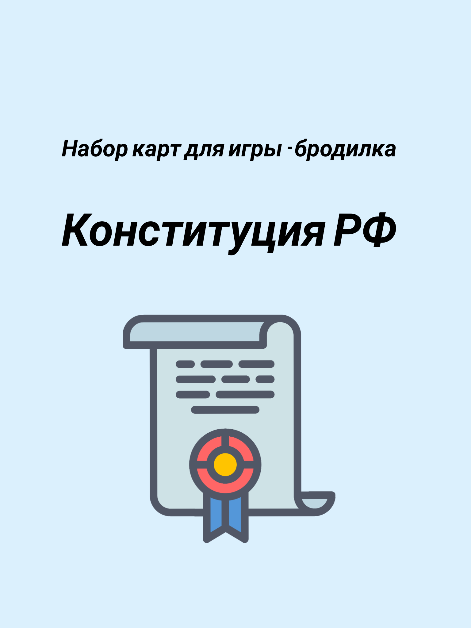 Набор содержит 22 карточки по теме «Конституция РФ» для игры-бродилкиИнструкция: Распечатайте и вырежьте карточки, разложите на полу текстом вниз так, чтобы из карточек образовалась дорожка. Заготовьте кубик для игры.