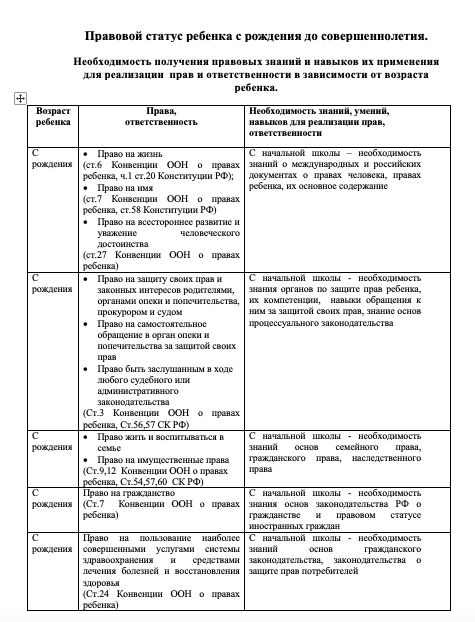 Правовое обеспечение профессиональной деятельностиНа тему «Правовой статус ребенка с рождения до совершеннолетия»Подробная таблица: Необходимость получения правовых знаний и навыков их применения для реализации прав и ответственности в зависимости от возраста ребенка.