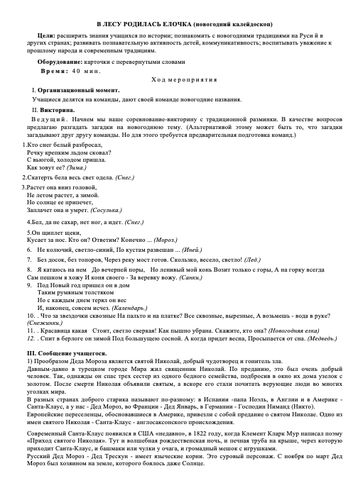 В ЛЕСУ РОДИЛАСЬ ЕЛОЧКА (новогодний калейдоскоп)Цели: расширить знания учащихся по истории; познакомить с новогодними традициями на Руси й в других странах; развивать познавательную активность детей, коммуникативность; воспиты¬вать уважение к прошлому народа и современным традициям.