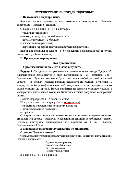 ПУТЕШЕСТВИЕ НА ПОЕЗДЕ “ЗДОРОВЬЕ”I. Подготовка к мероприятию.