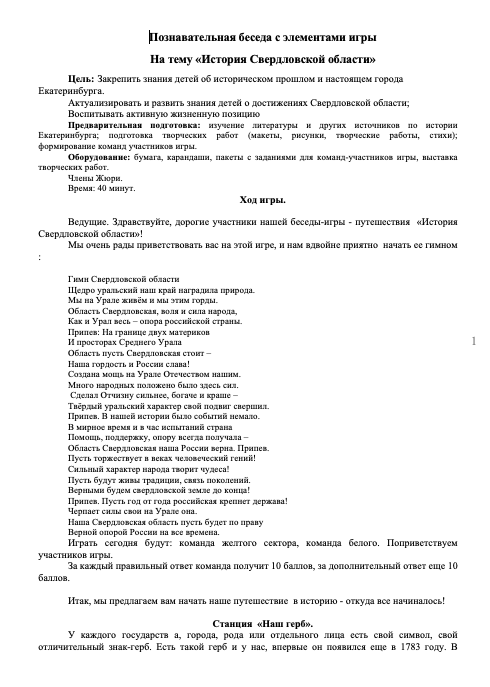 Познавательная беседа с элементами игры. На тему «История Свердловской области»