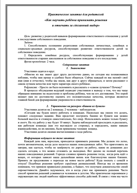 Цель: развитие у родителей навыков формирования ответственного отношения у детей к последствиям собственного поведения.Задачи: Способствовать осознанию родителями собственных личностных, семейных и социально-средовых ресурсов, способствующих развитию ответственности детей за собственное поведение.Определить семейные ресурсы, способствующие формированию у детей ответственности старших школьников за собственное поведение и его последствия.Время проведения: 2 часа.Содержание занятия
