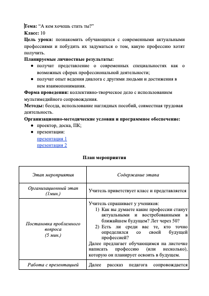 План урока. Тема: “А кем хочешь стать ты?”Класс: 10Цель урока: познакомить обучающихся с современными актуальными профессиями и побудить их задуматься о том, какую профессию хотят получить.Планируемые личностные результаты:● получат представление о современных специальностях как о возможных сферах профессиональной деятельности;● получат опыт ведения диалога с другими людьми и достижения в нем взаимопонимания.