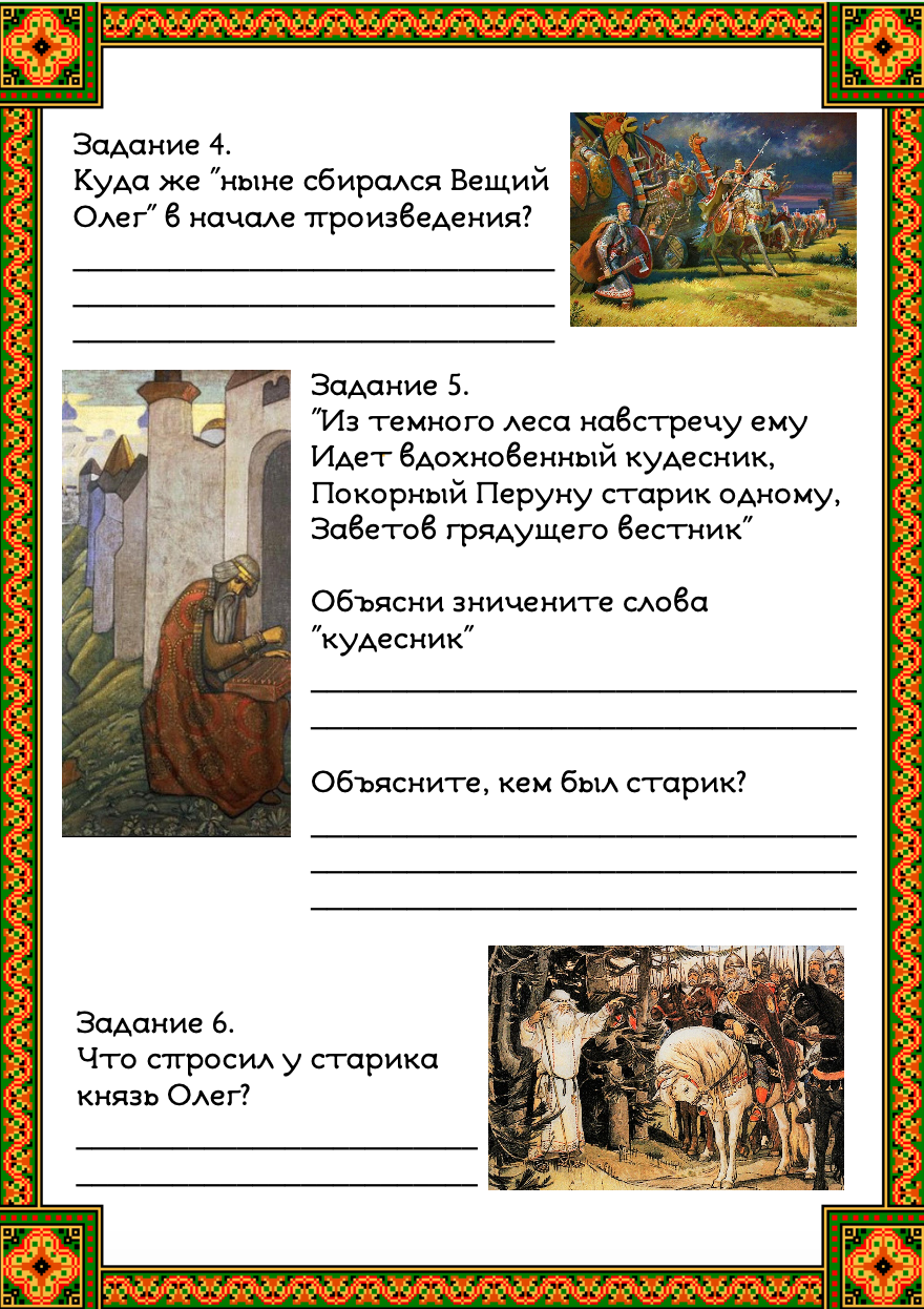 Рабочая тетрадь с 21 заданием по произведению "Песнь о Вещем Олеге"