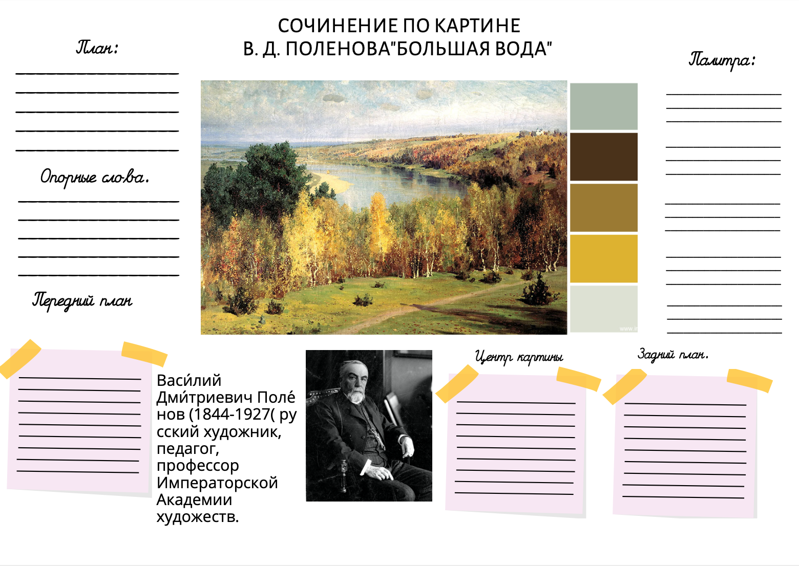 15 рабочих листов "Сочинение по картине" с картинами, цветовой палитрой, кратким описанием автора и заданиями