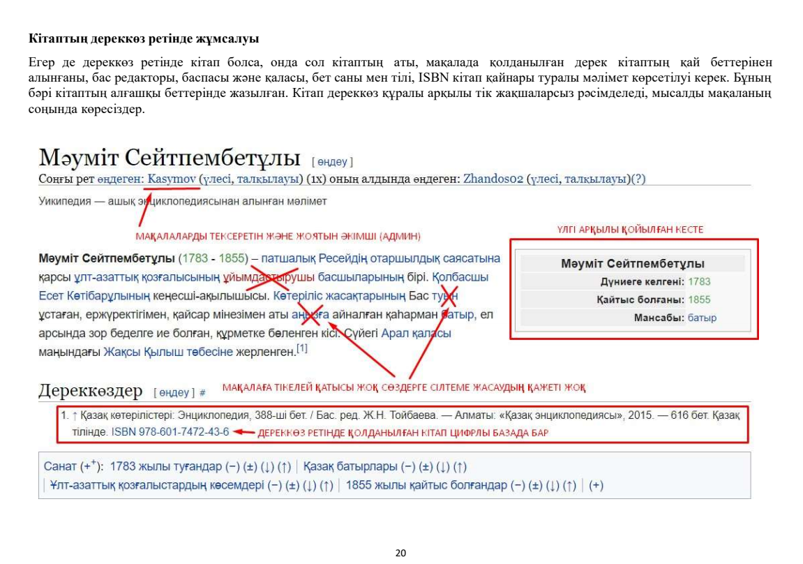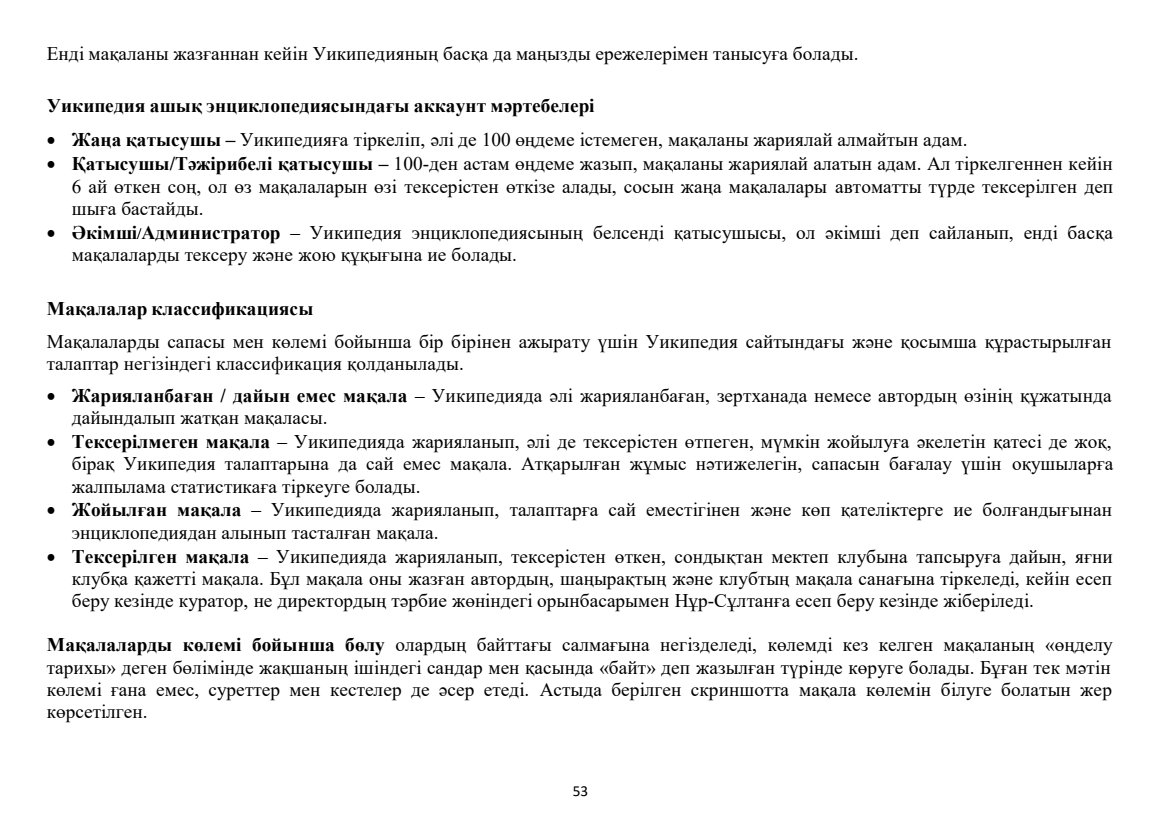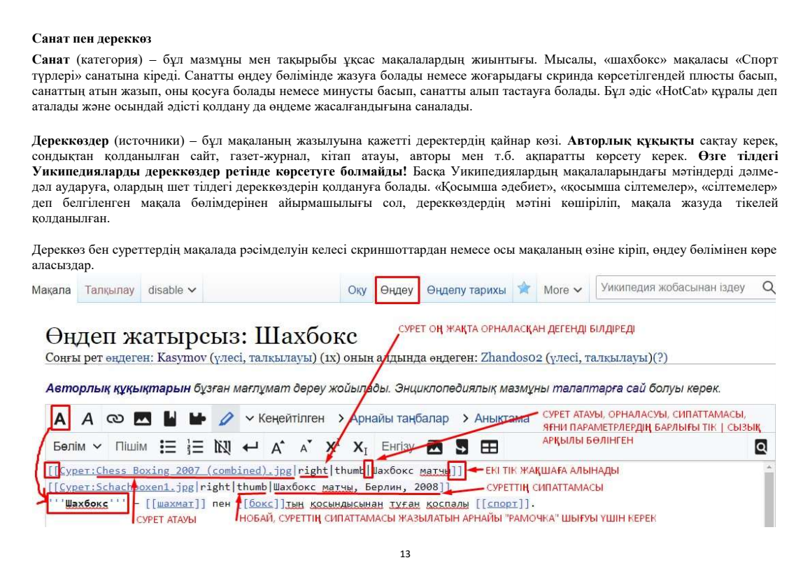 Уикипедия ашық энциклопедиясында мақала өңдеу мен жазу бойынша "Уикиоқулық" атты әдістемелік құралы. Автор туралы: Батырханов Ж. К. - Қостанай қаласындағы физика-математика бағытындағы Назарбаев Зияткерлік мектебінде «Уикипедия» клубы негізін қалаушыларының бірі және де бірінші басшысы. Уикипедия ісімен 2017 жылдан бері айналысуда, ашық энциклопедияда 50-ден астам мақала, 500-ге жуық өңдеме жазған. Уикипедия бойынша бірнеше әдістемелік құралдардың авторы. 100-ден астам оқушыға онлайн/оффлайн сабақ берді. Назарбаев Зияткерлік мектептерінің Уикипедиядан координаторларының тұңғыш құрылтайын ұйымдастырып, НЗМ «Уикипедия» Клубтары Федерациясының негізін қалады.