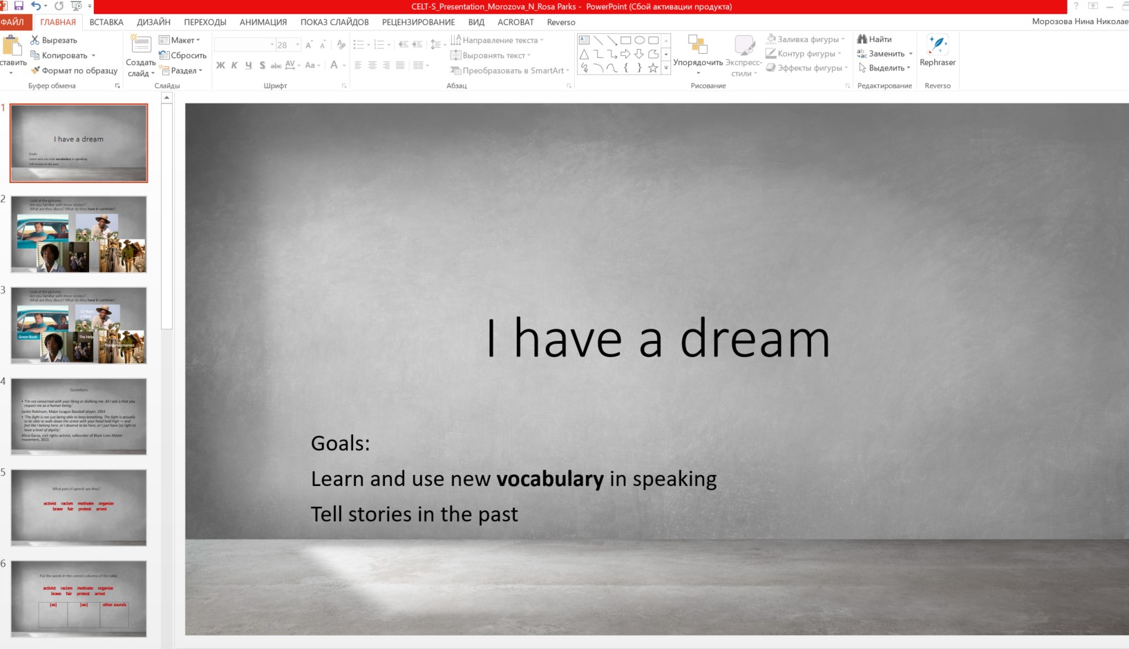 Урок разработан по стандартам методики CELT-S для студентов с уровнем B1 (Human rights movemenet in America). Возраст студентов от 14 лет. Отработан на студентах 1 курса университета.