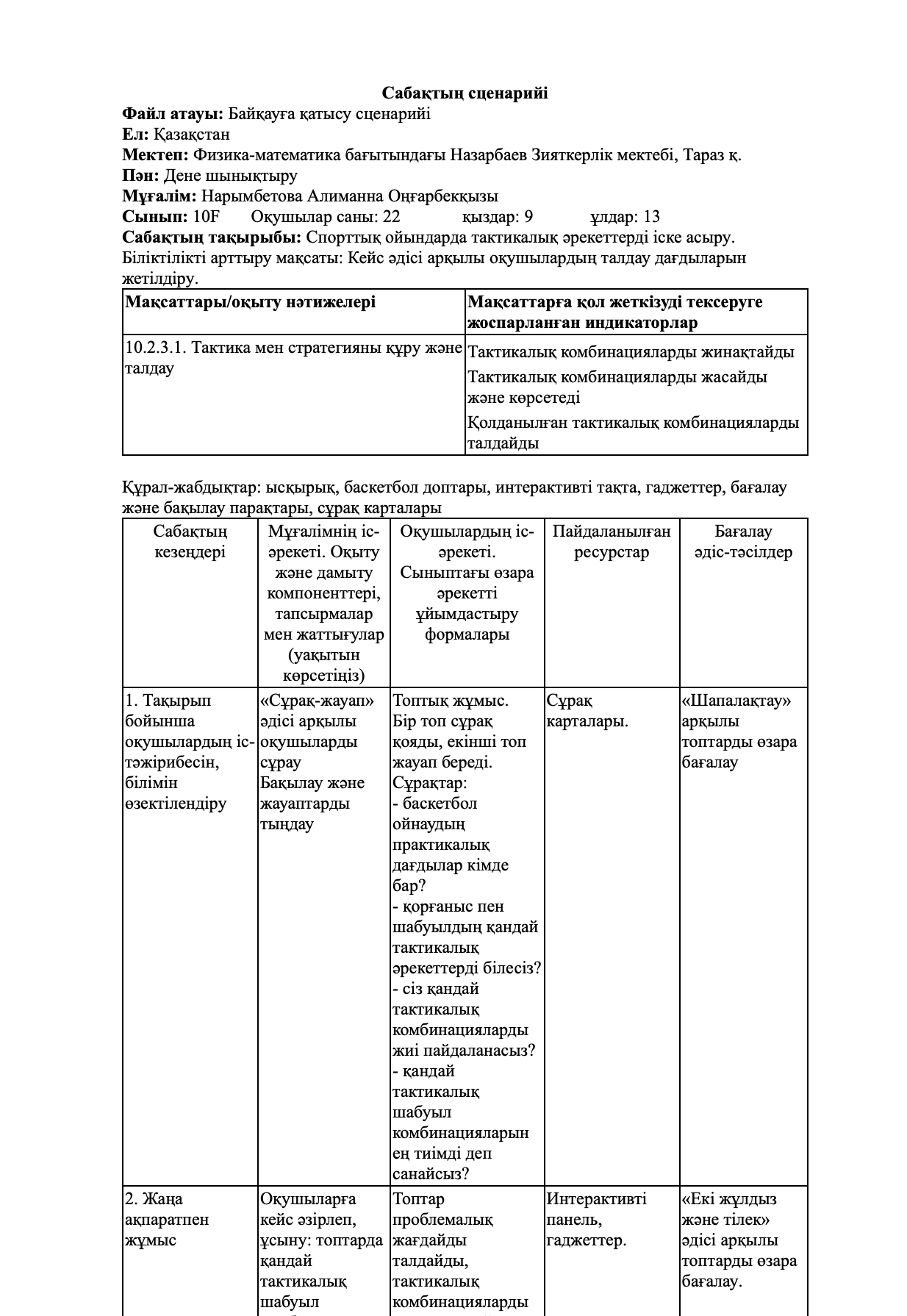 Сабақтың сценарийі. Спорттық ойындарда тактикалық әрекеттерді іске асыру