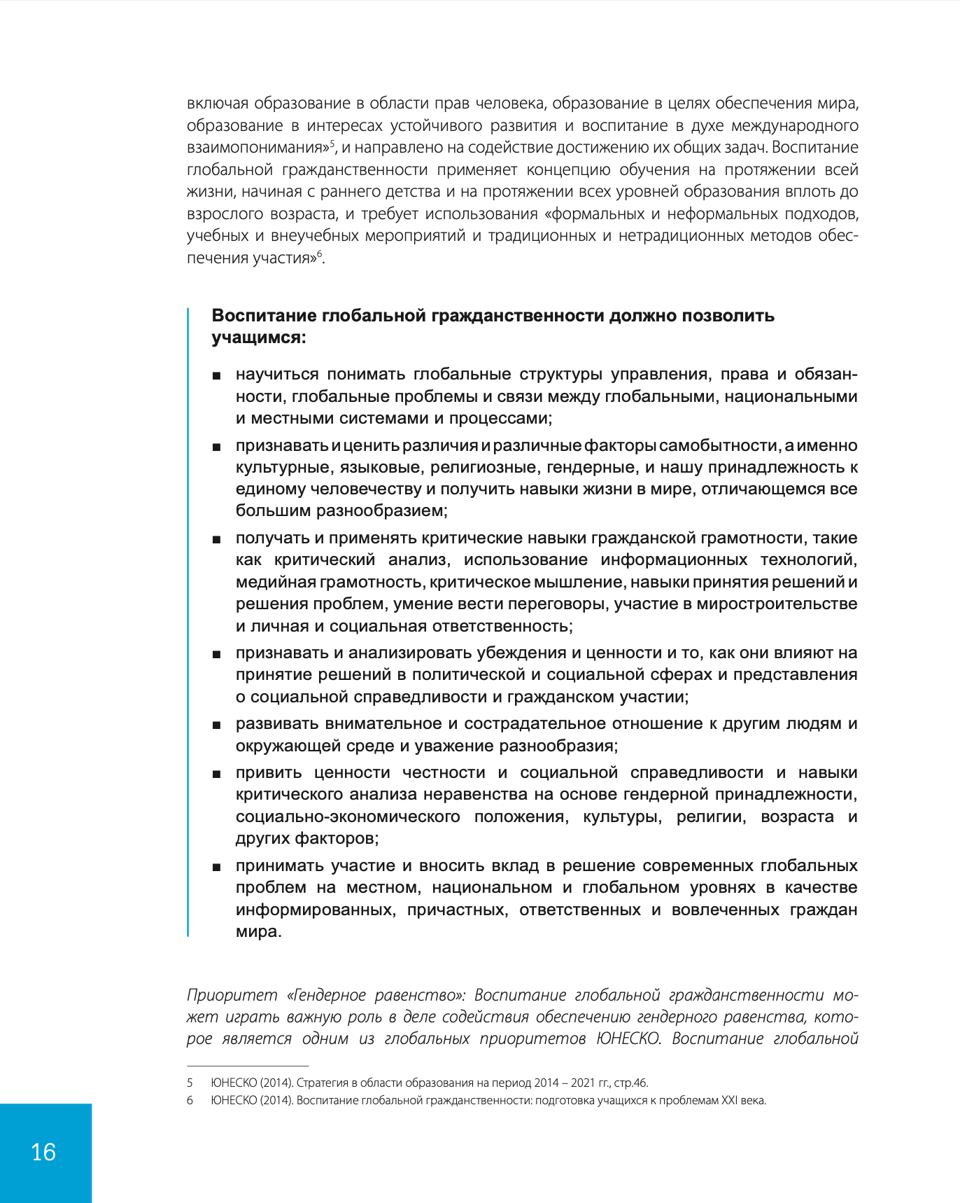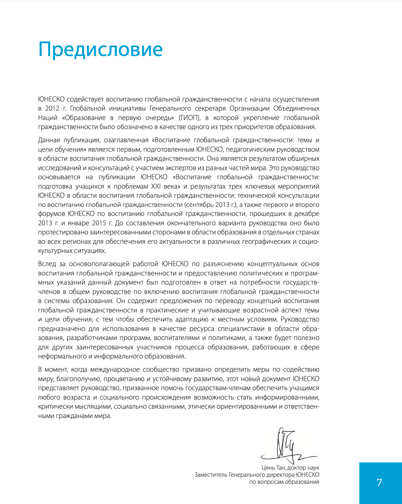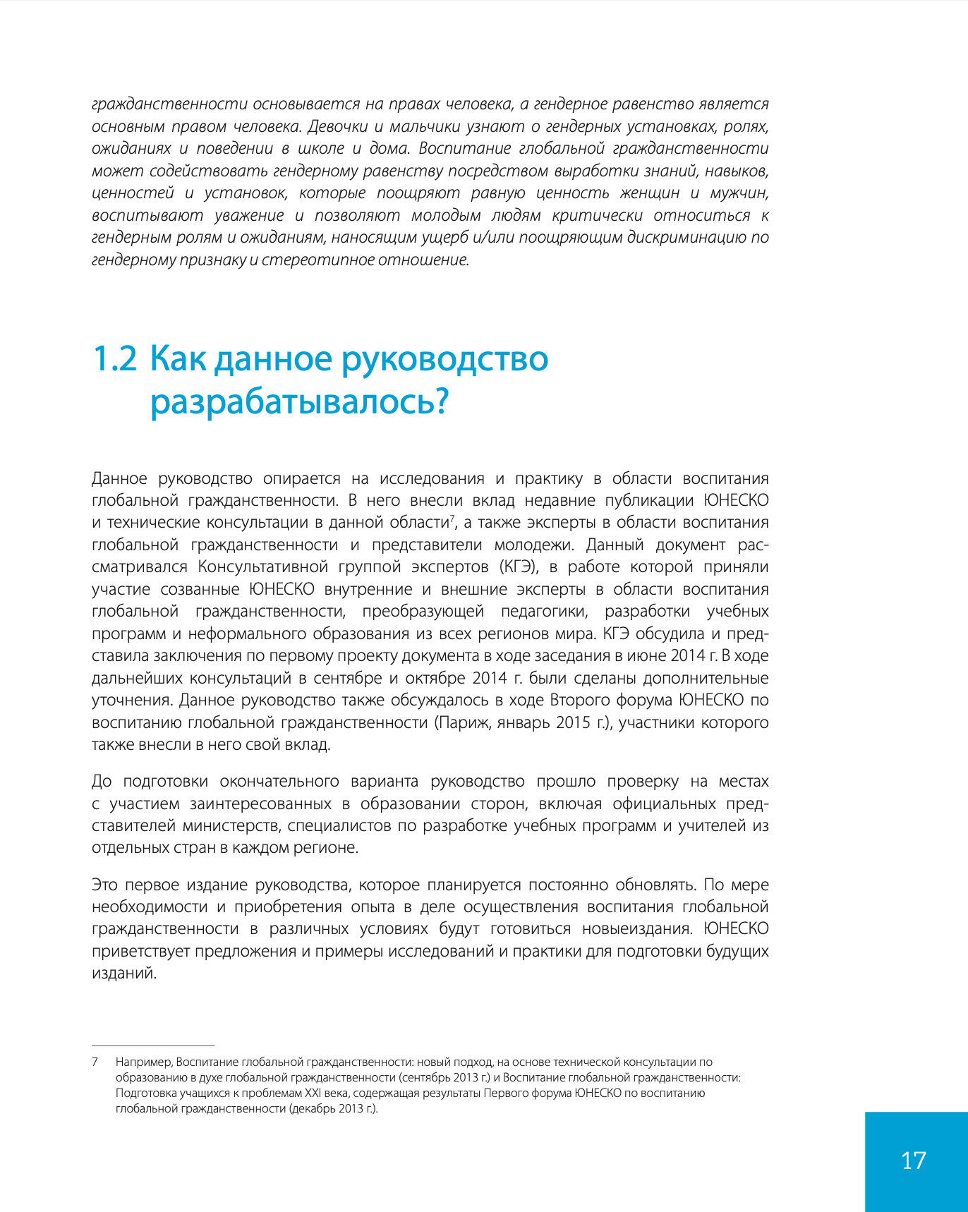Данная публикация, озаглавленная «Воспитание глобальной гражданственности: темы и цели обучения» является первым, подготовленным ЮНЕСКО, педагогическим руководством в области воспитания глобальной гражданственности. Она является результатом обширных исследований и консультаций с участием экспертов из разных частей мира. Это руководство основывается на публикации ЮНЕСКО «Воспитание глобальной гражданственности: подготовка учащихся к проблемам XXI века» и результатах трех ключевых мероприятий ЮНЕСКО в области воспитания глобальной гражданственности: технической консультации по воспитанию глобальной гражданственности (сентябрь 2013 г.), а также первого и второго форумов ЮНЕСКО по воспитанию глобальной гражданственности, прошедших в декабре 2013 г. и январе 2015 г. До составления окончательного варианта руководства оно было протестировано заинтересованными сторонами в области образования в отдельных странах во всех регионах для обеспечения его актуальности в различных географических и социо- культурных ситуациях.