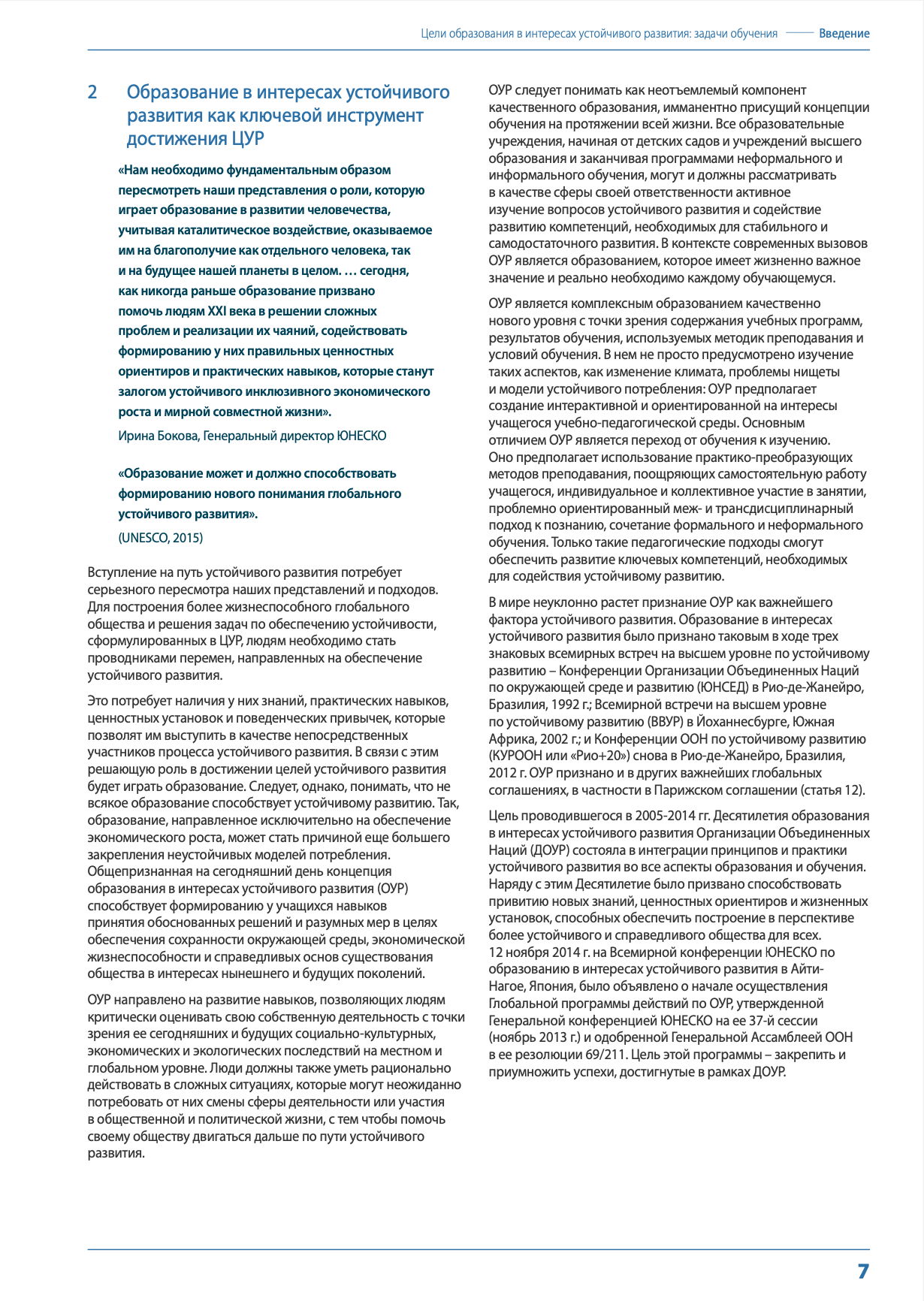 ЮНЕСКО занимается поощрением образования в интересах устойчивого развития (ОУР) с 1992 г. Организация сыграла ведущую роль в проведении Десятилетия образования в интересах устойчивого развития Организации Объединенных Наций (2005- 2014 гг.), а сегодня возглавляет усилия, связанные с последующей деятельностью по итогам ДОУР и осуществлением Глобальной программы действий (ГПД) по образованию в интересах устойчивого развития.