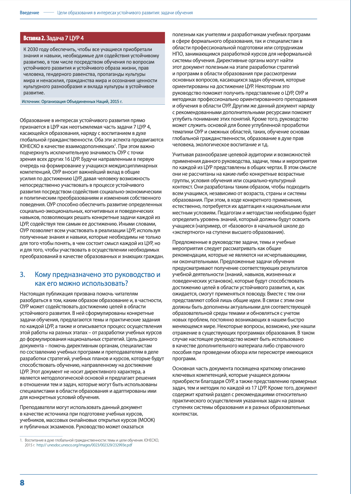 Настоящая публикация призвана стать руководством для специалистов в области образования по вопросам применения принципов ОУР в обучении в интересах достижения целей в области устойчивого развития. Таким образом, она призвана содействовать достижению ЦУР. В этом руководстве сформулированы типовые задачи обучения и предложены темы и практические учебные задания по каждой ЦУР. В нем также представлены методы реализации этих задач на различных этапах - от разработки учебных курсов до формулирования национальных стратегий.