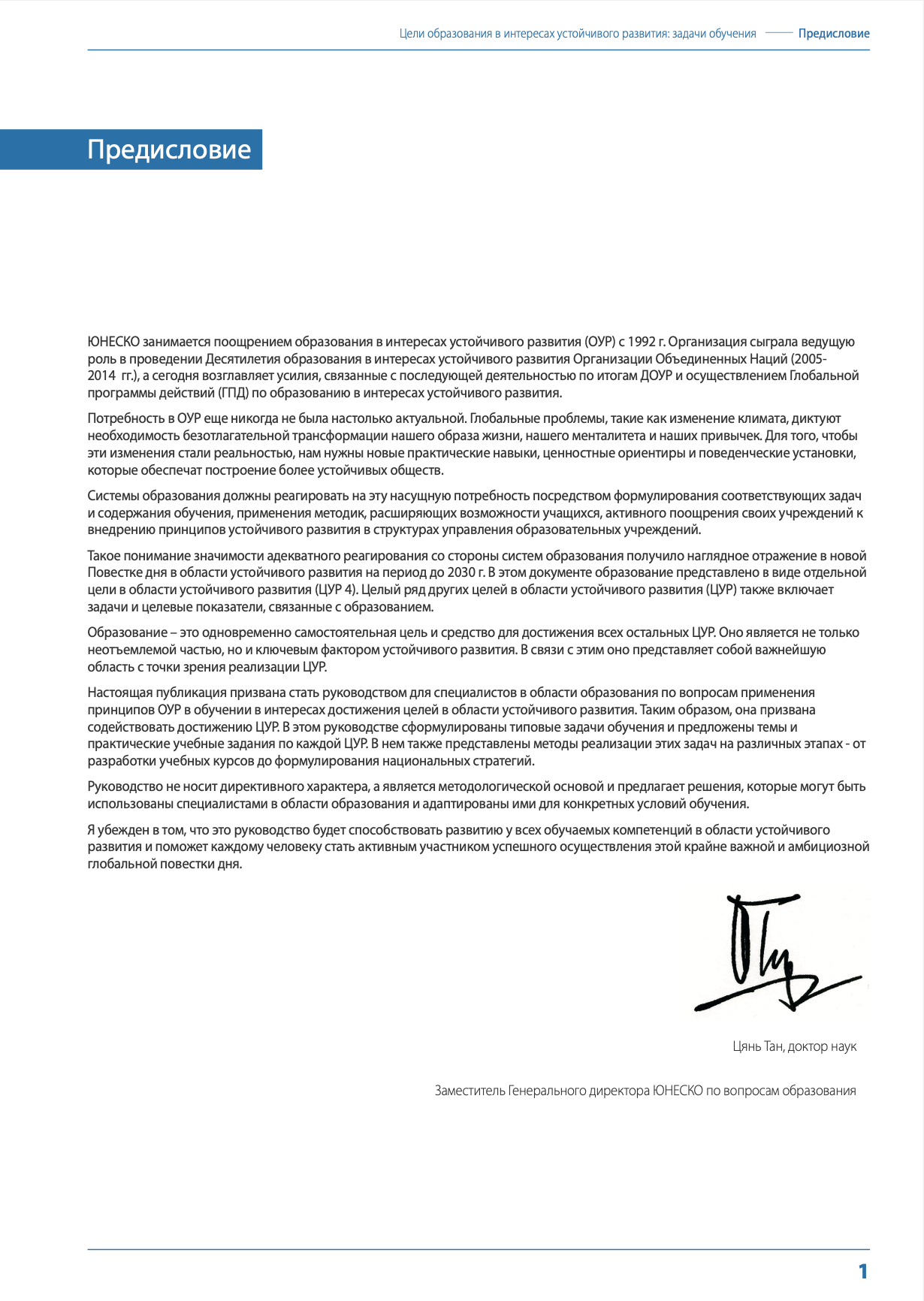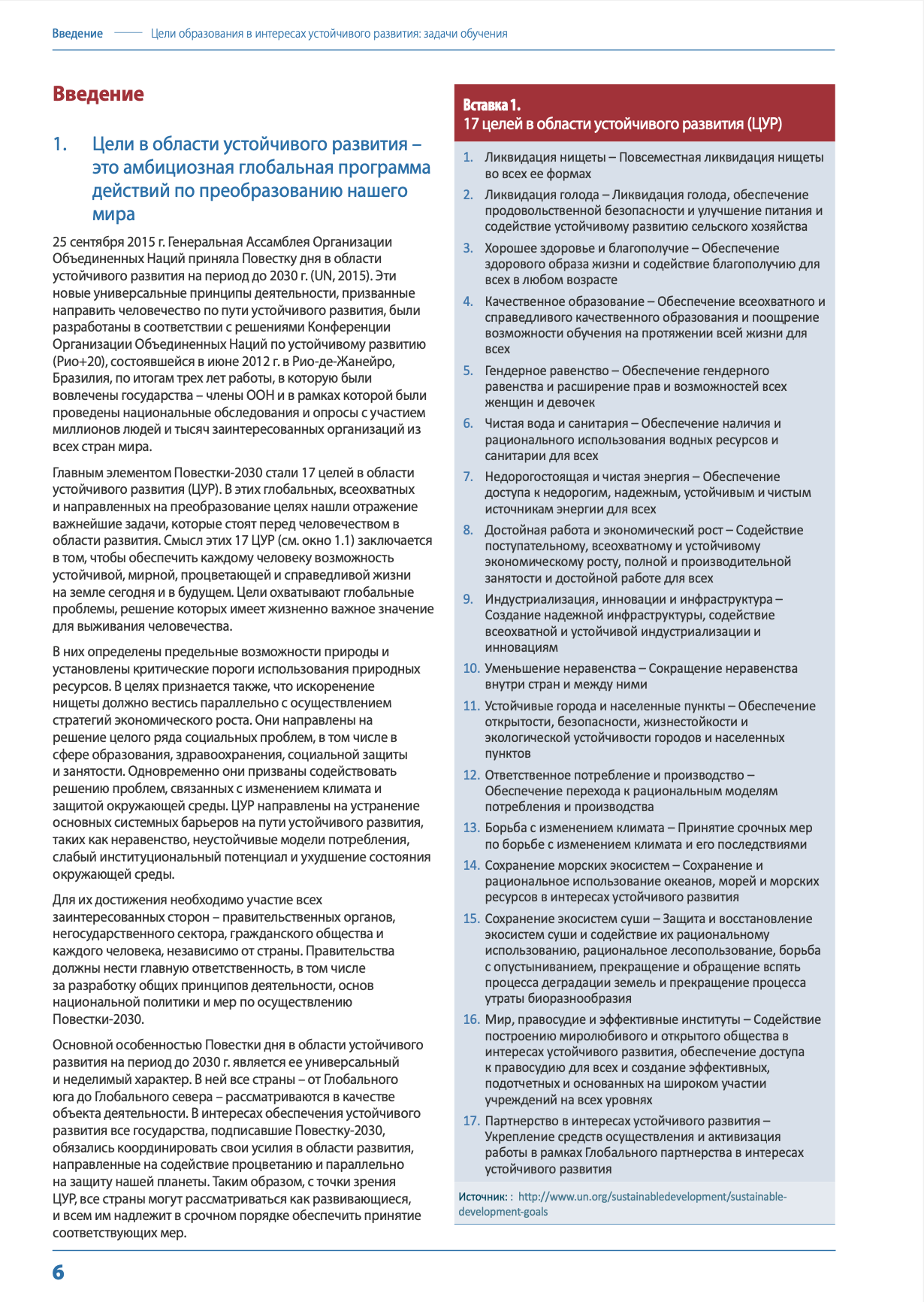 Такое понимание значимости адекватного реагирования со стороны систем образования получило наглядное отражение в новой Повестке дня в области устойчивого развития на период до 2030 г. В этом документе образование представлено в виде отдельной цели в области устойчивого развития (ЦУР 4). Целый ряд других целей в области устойчивого развития (ЦУР) также включает задачи и целевые показатели, связанные с образованием.