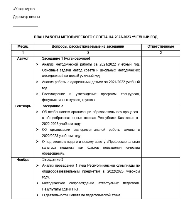 План работы методического совета содержит подробную тематику шести заседаний. Можно использовать в качестве шаблона.
