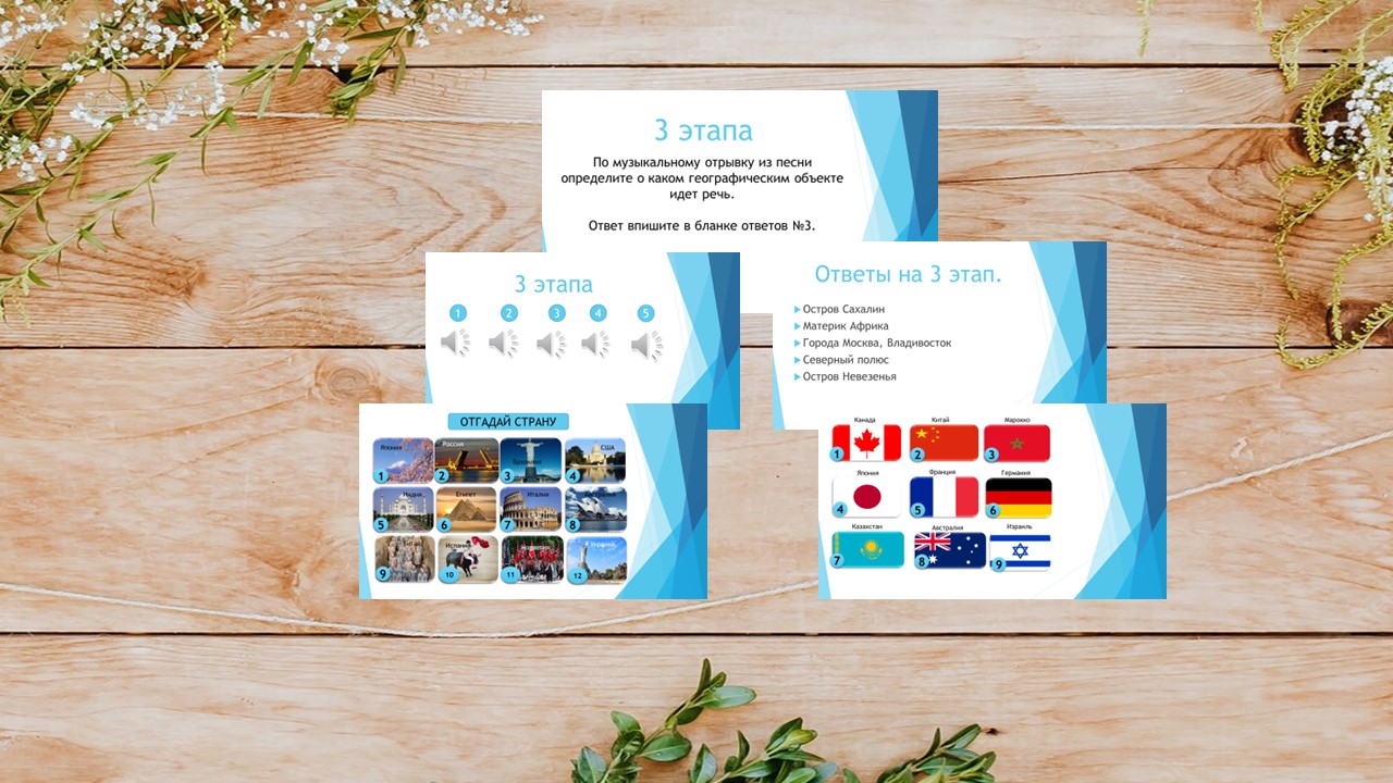 3 этап включает пять песен о географических объектах, по отрывкам необходимо угадать о каких именно.