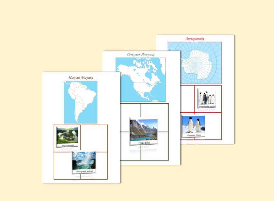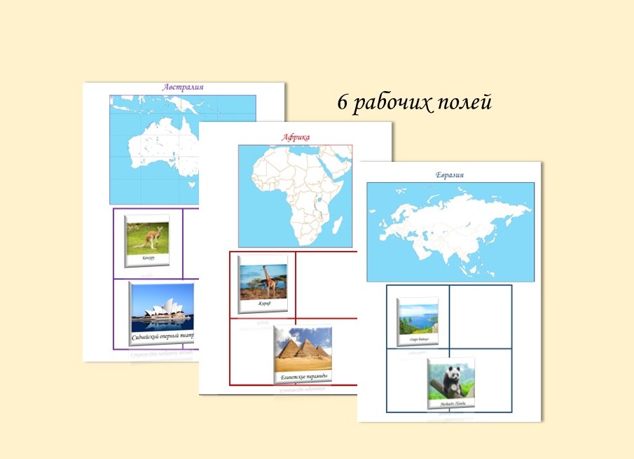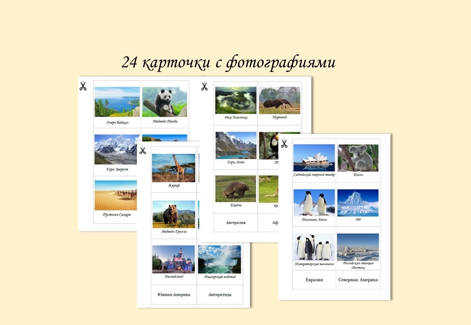 В набор входит 24 карточки с фотографиями, 6 карточек с названиями материков и 6 рабочих полей.