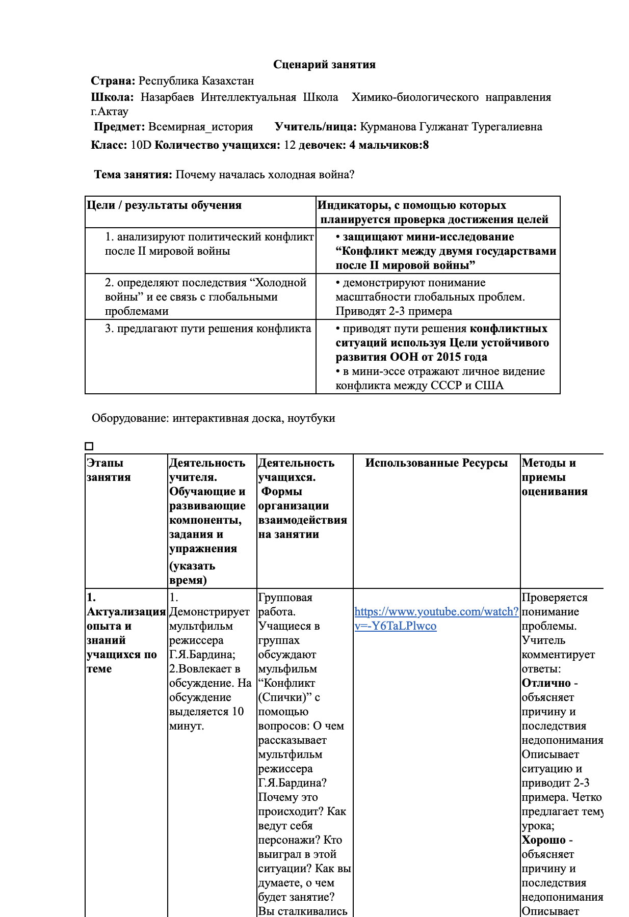 Сценарий занятия к предмету "Всемирная история", 10 класс. Тема: "Почему началась холодная война?"