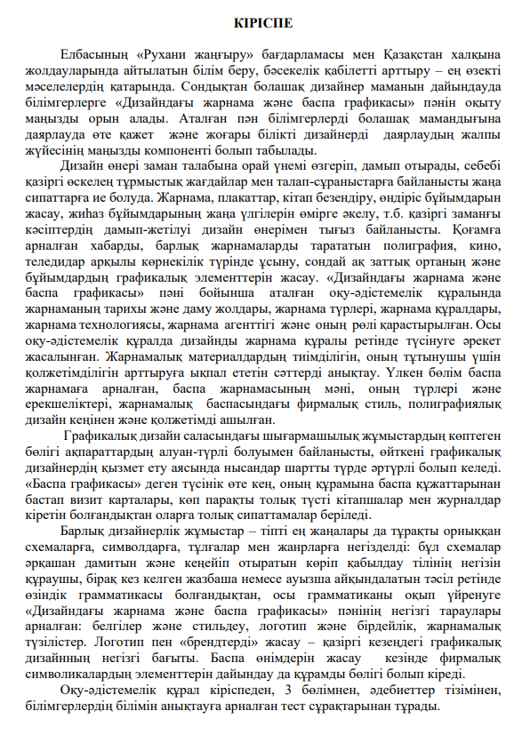 Болашақ дизайнер маманын дайындауда білімгерлерге «Дизайндағы жарнама және баспа графикасы» пәнін оқыту маңызды орын алады. Аталған пән білімгерлерді болашақ мамандығына даярлауда өте қажет және жоғары білікті дизайнерді даярлаудың жалпы жүйесінің маңызды компоненті болып табылады.