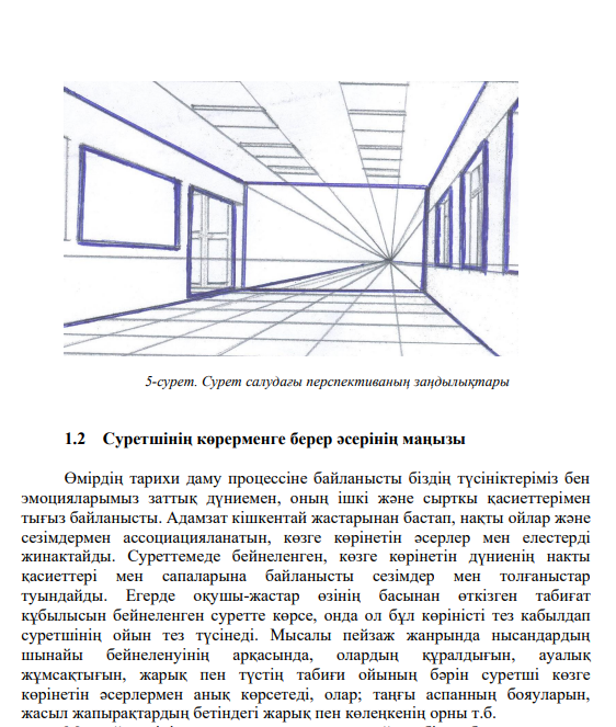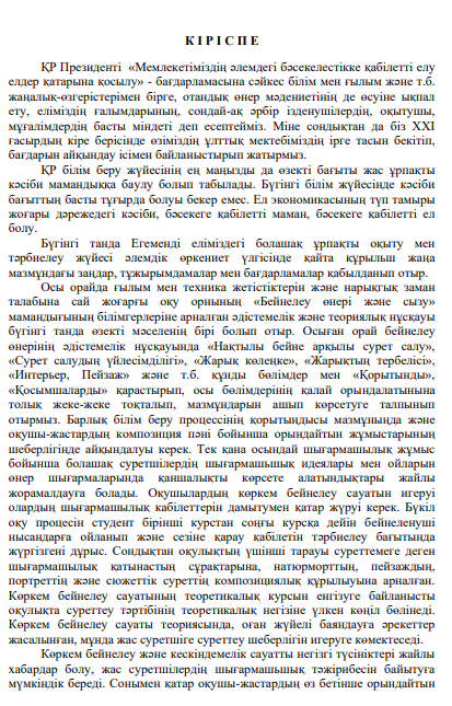 Бейнелеу өнерінің әдістемелік нұсқауында «Нақтылы бейне арқылы сурет салу», «Сурет салудың үйлесімділігі», «Жарық көлеңке», «Жарықтың тербелісі», «Интерьер, Пейзаж» және т.б. құнды бөлімдер мен «Қорытынды», «Қосымшаларды» қарастырып, осы бөлімдерінің қалай орындалатынына толық жеке-жеке тоқталып, мазмұндарын ашып көрсетуге талпынып отырмыз. Барлық білім беру процессінің қорытыңдысы мазмұныңда және оқушы-жастардың композиция пәні бойынша орындайтын жұмыстарының шеберлігінде айқындалуы керек. Тек қана осындай шығармашылық жұмыс бойынша болашақ суретшілердің шығармашьшық идеялары мен ойларын өнер шығармаларында қаншалықты көрсете алатындықтары жайлы жорамалдауға болады. Оқушылардың көркем бейнелеу сауатын игеруі олардың шығармашылық кабілеттерін дамытумен қатар жүруі керек. Бүкіл оқу процесін студент бірінші курстан соңғы курсқа дейін бейнеленуші нысандарға ойланып және сезіне қарау қабілетін тәрбиелеу бағытында жүргізгені дұрыс. Сондықтан оқулықтың үшінші тарауы суреттемеге деген шығармашылық қатынастың сұрақтарына, натюрморттың, пейзаждың, портреттің және сюжеттік суреттің композициялық құрылыуына арналған. Көркем бейнелеу сауатының теоретикалық курсын енгізуге байланысты оқулықта суреттеу тәртібінің теоретикалық негізіне үлкен көңіл бөлінеді. Көркем бейнелеу сауаты теориясында, оған жүйелі баяндауға әрекеттер жасалынған, мұнда жас суретшіге суреттеу шеберлігін игеруге көмектеседі.