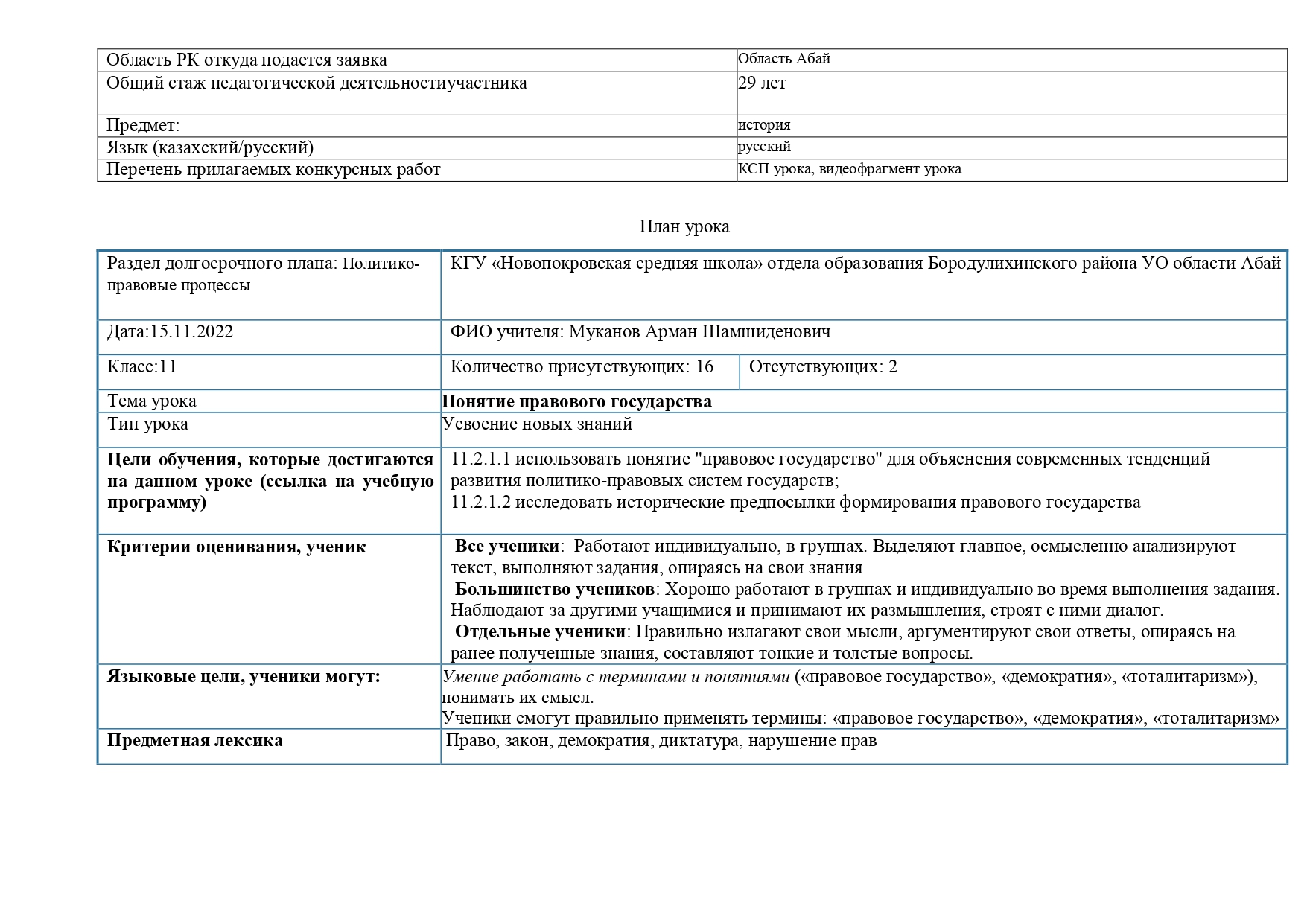 План урока по всемирной истории 11 класс "Понятие правового государства", 1.5 мин видео саморефлексия