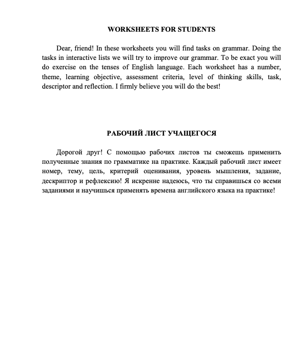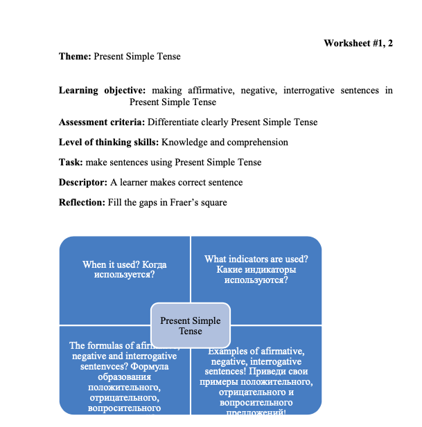Данный тренажёр составлен на тренировку времён английского языка. На каждое время имеется отдельный тренажёрный лист с заданием. В тренажёрный лист входит: тема, цель, критерий оценивания, уровень мыслительных навыков, задание, дескриптор, рефлексия.