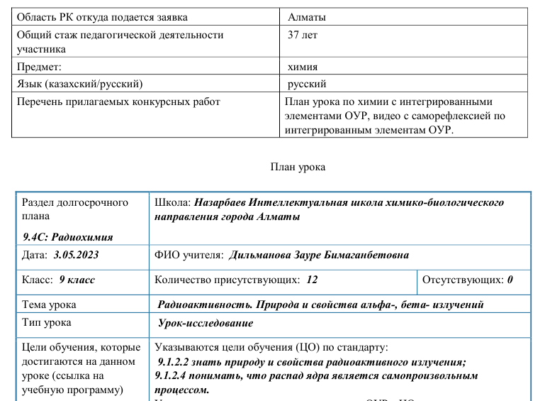 План урока по химии с интегрированными элементами ОУР, 2 - мин видео с саморефлексией по интегрированным элементам ОУР.